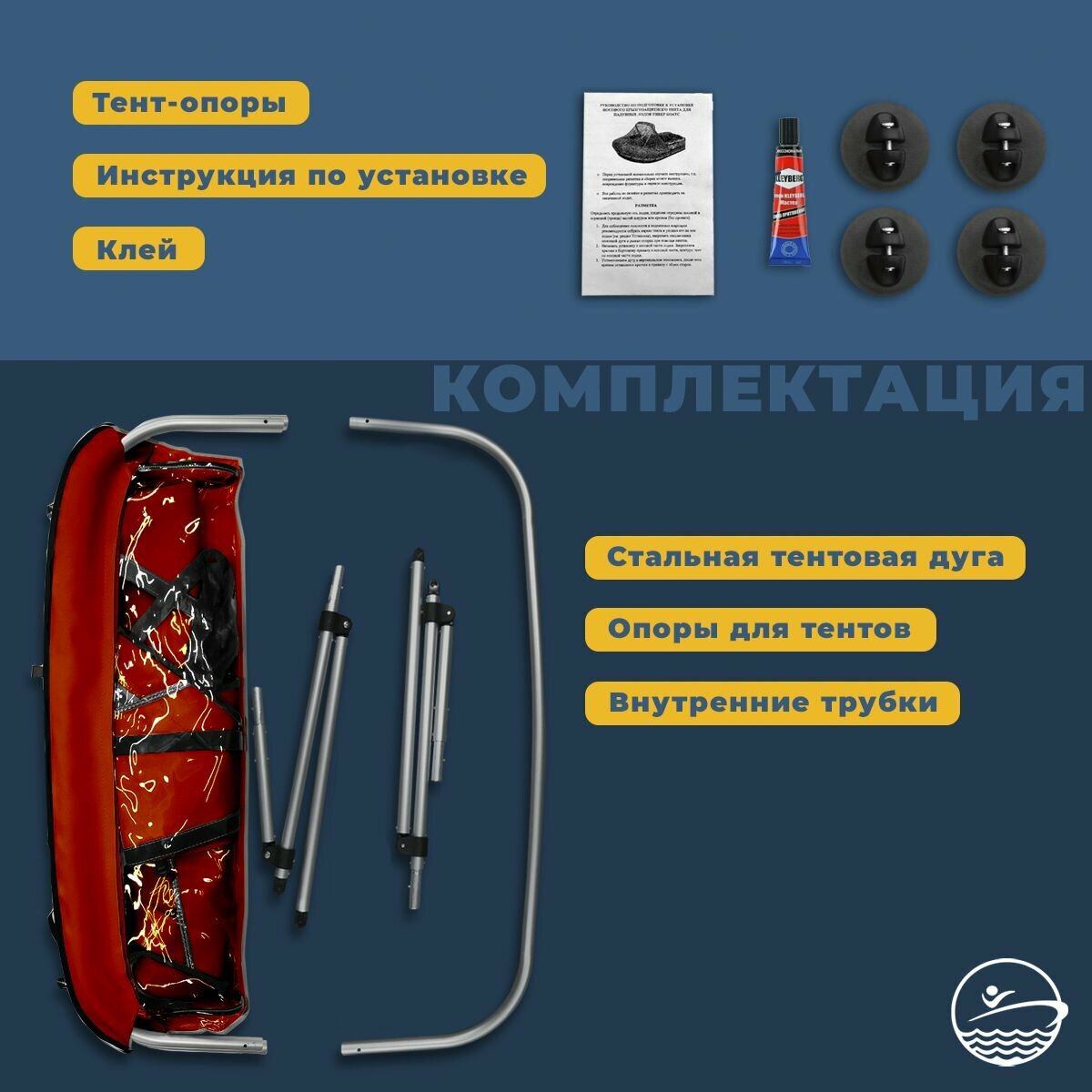 В комплекте с тентом идет тарга. Она изготавливается из алюминиевой анодированной трубы диаметром 22 мм. Дуга жестко фиксируется на баллонах. На нее с легкость можно установить несколько стаканов для спиннингов. Тент разработан с учетом больших нагрузок рассчитанных, в том числе, на использование корабликов для рыбалки.