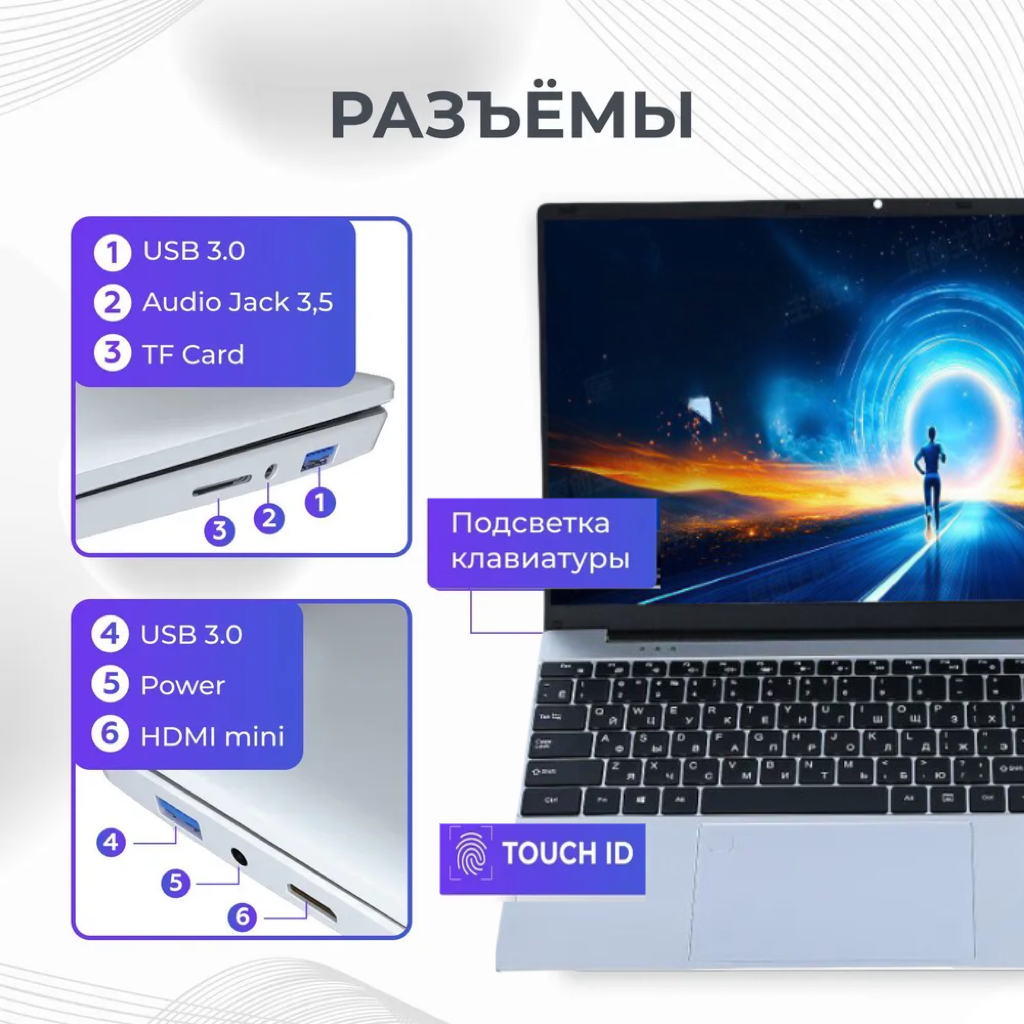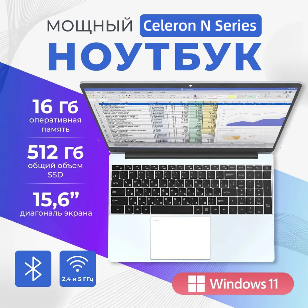 Ноутбук с диагональю 15,6" оснащен процессором Intel N95 с частотой 3,4 ГГц, что обеспечивает высокую производительность и быстродействие. Оперативная память 16 ГБ DDR4 позволяет работать с несколькими приложениями одновременно без замедления работы.