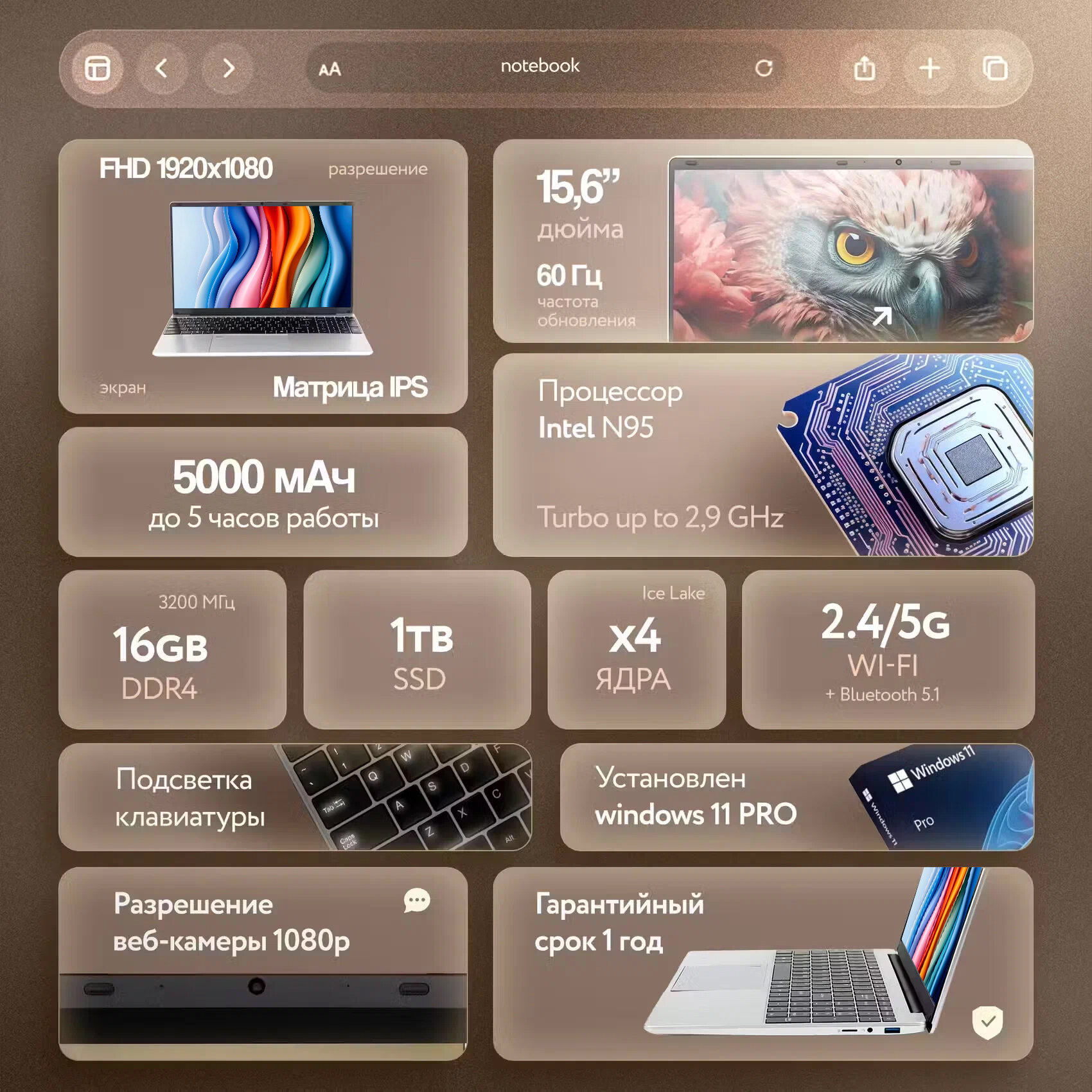 Купить Ноутбук 15.6″, Intel N95, RAM 16 ГБ, SSD 1024 ГБ, Intel UHD Graphics, Windows 11, серый, Русская раскладка с доставкой по всей России.