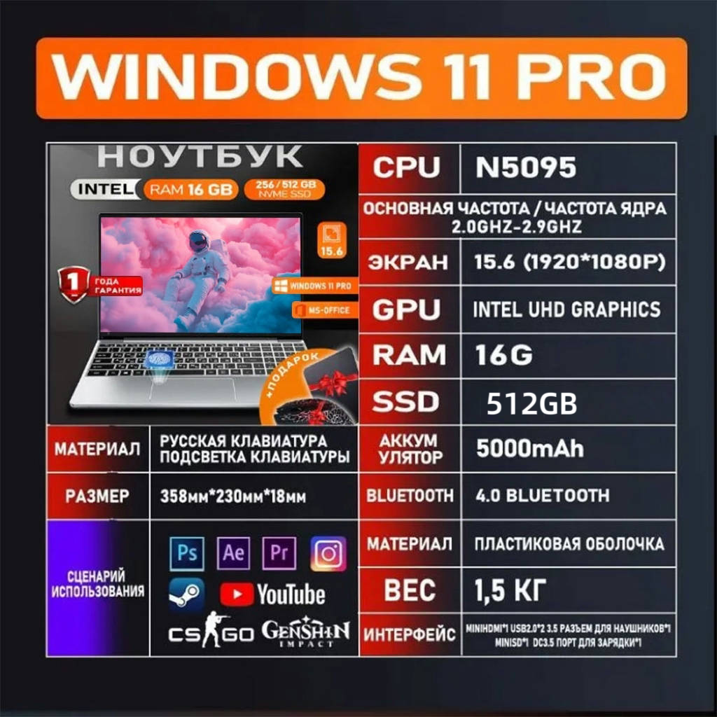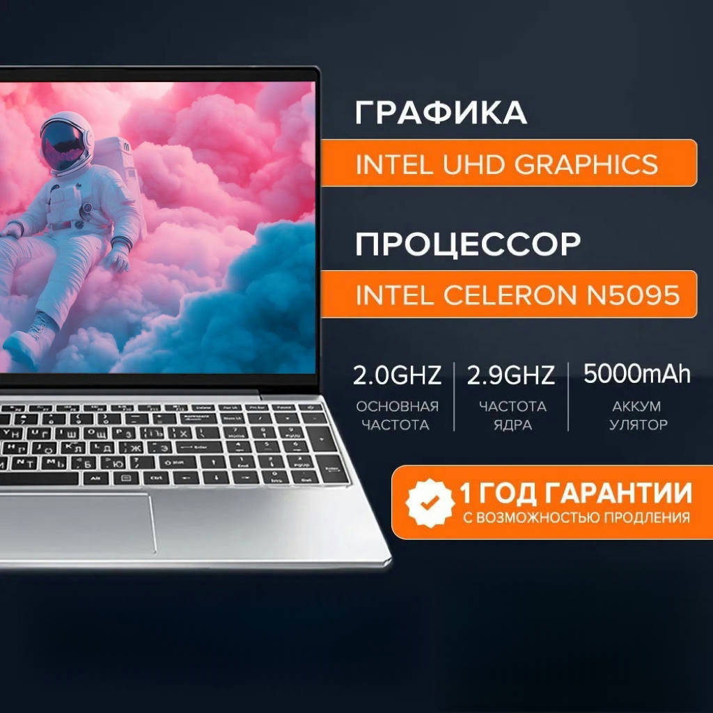 Купить Ноутбук 15,6″ с процессором Intel Celeron5095, 16 Гб ОЗУ, 512 Гб SSD, Windows 11 Серебро для работы и учебы с доставкой по всей России.