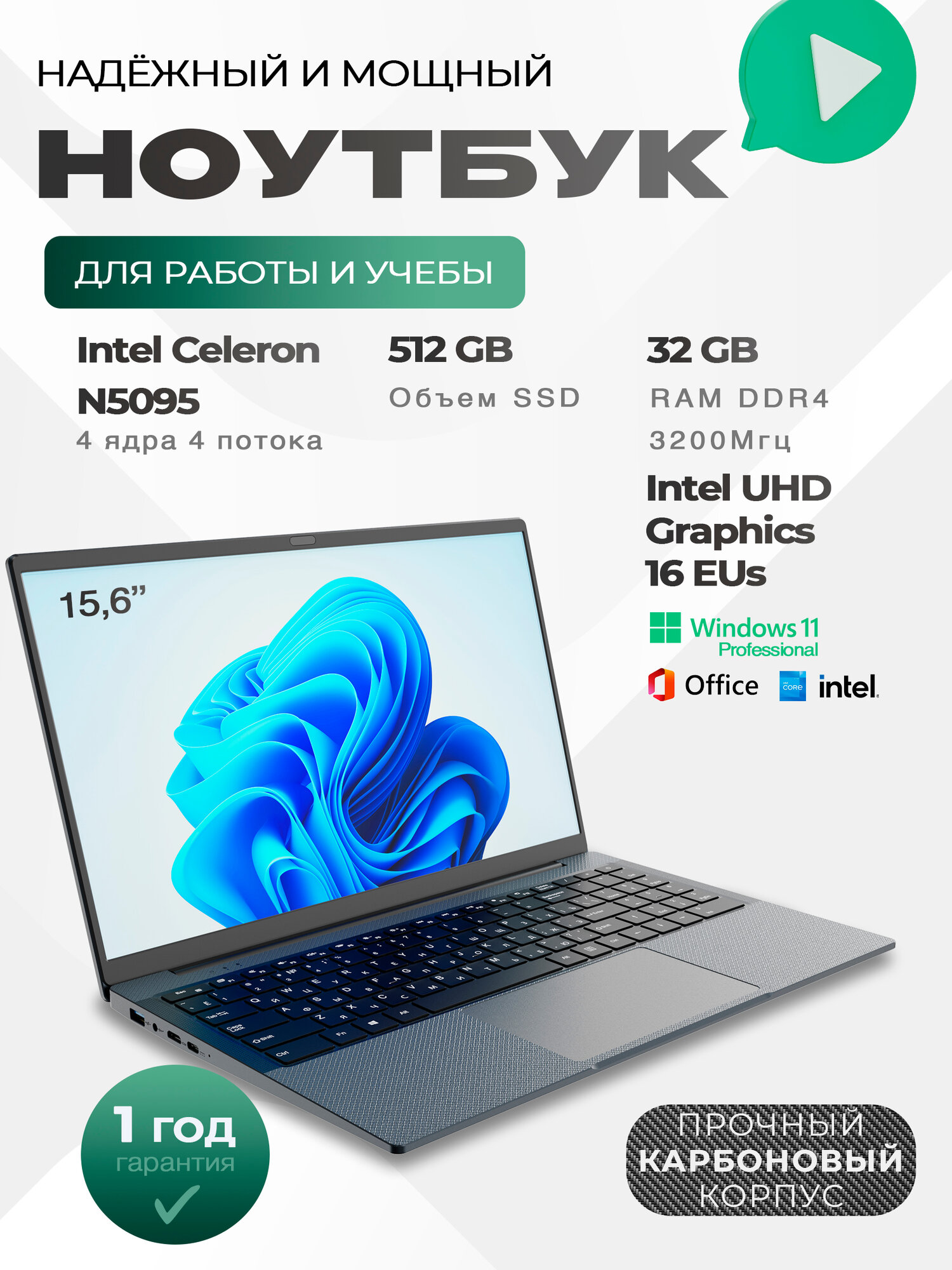 Купить Ноутбук для работы и учебы 15.6″ DIVAO Carbon 1920×1080 IPS Intel Celeron N5095 32GB RAM SSD 512 GB Windows 11 Pro с доставкой по всей России.