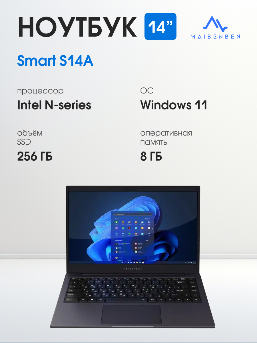 Купить 14″ Ноутбук MAIBENBEN Smart S14A, IPS 60 Гц, Intel N100 (0.8 Гц), 8/256 ГБ, Win 11 Home, темно-синий с доставкой по всей России.