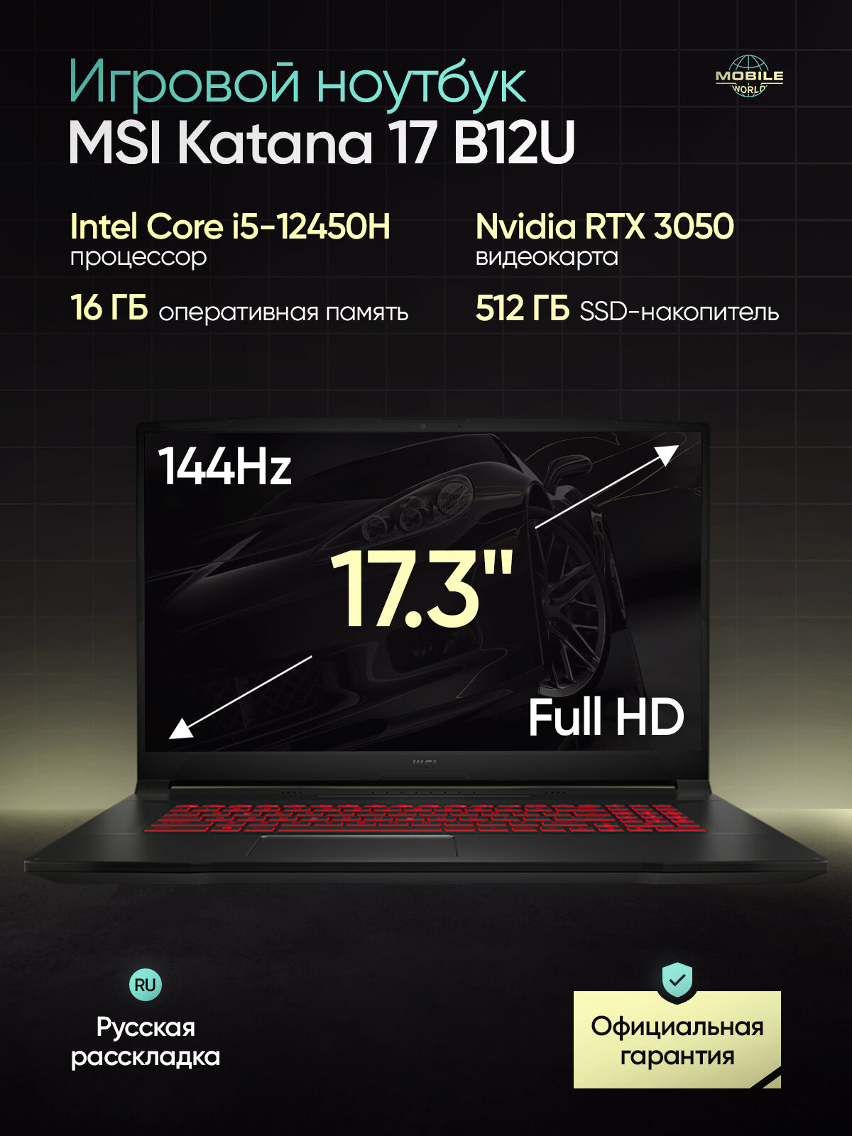 Ноутбук MSI Katana 17 B12UCR-1466XRU черный (9S7-17L541-1466), Core i5-12450H, 16Гб/1Тб, NVIDIA GeForce RTX 3050 (4Гб) Win 11 Pro+MS Office Pro Plus 2021: сравнение цен, характеристики, фото, актуальное наличие и цены.