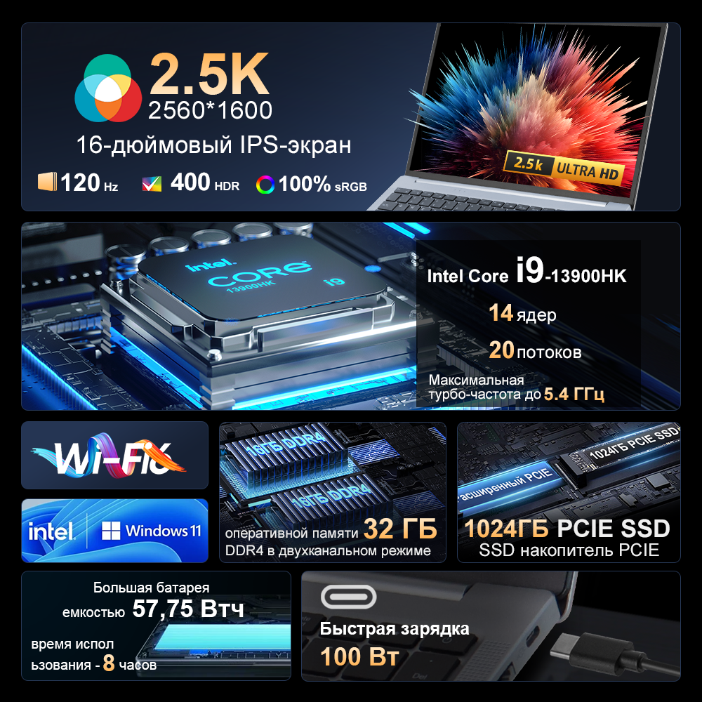 Купить Ноутбук Ninkear N16 PRO, 16″, 2560 x 1600, IPS, Core i9-13900HK, SSD 1ТБ, Windows 11 с доставкой по всей России.
