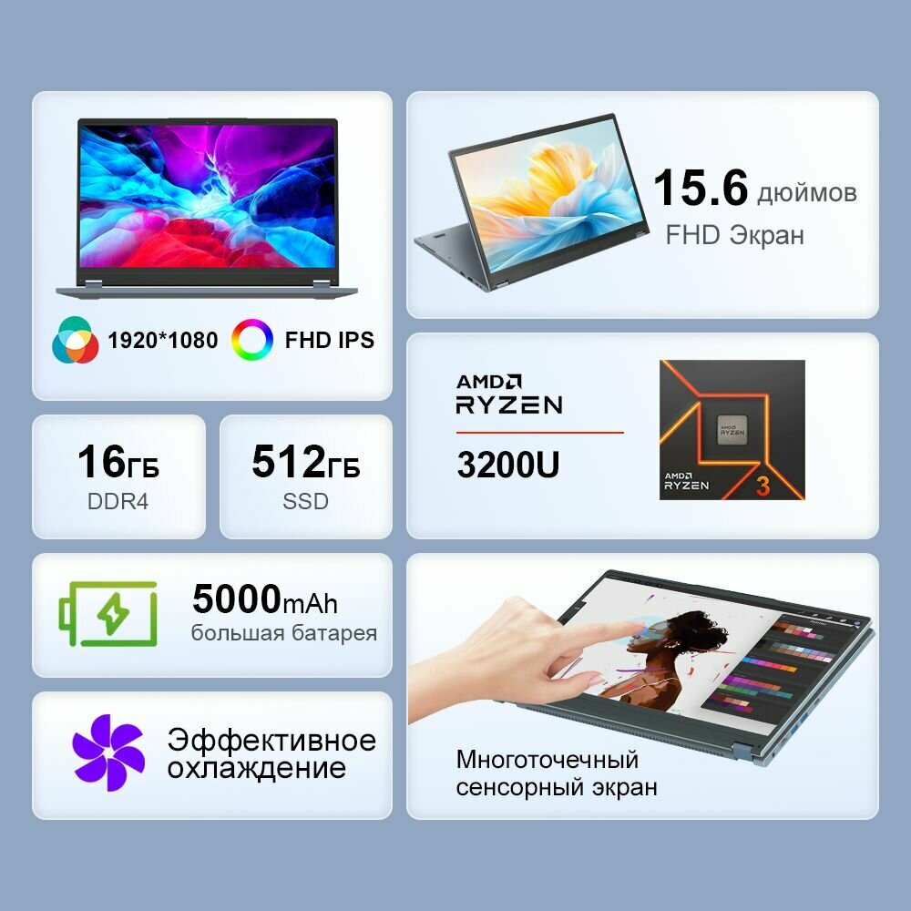 Купить Ноутбук Ninkear YBOOK 15, 15,6-дюймовый сенсорный экран, AMD Ryzen 3 3200U, 16 ГБ ОЗУ + 512 ГБ SSD, Windows 11 Pro с доставкой по всей России.
