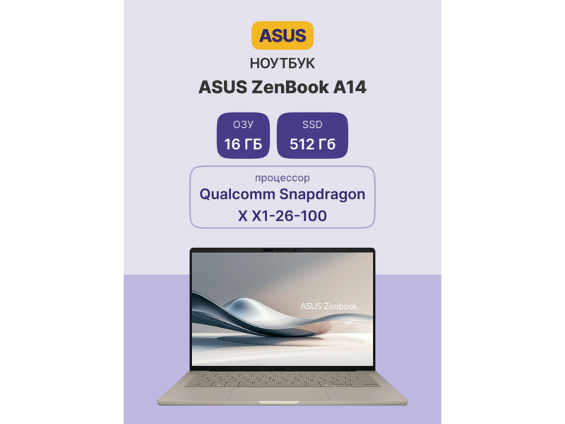 Ноутбук ноутбук/ UX3407QA-QD197W 14″(1920×1200 OLED)/Qualcomm Snapdragon X X1-26-100(2.98Ghz)/16384Mb/512PCISSDGb/noDVD/Cam/BT/WiFi/70WHr/war 1y/0.98kg/Zabriskie Beige/Win11Home: сравнение цен, характеристики, фото, актуальное наличие и цены.