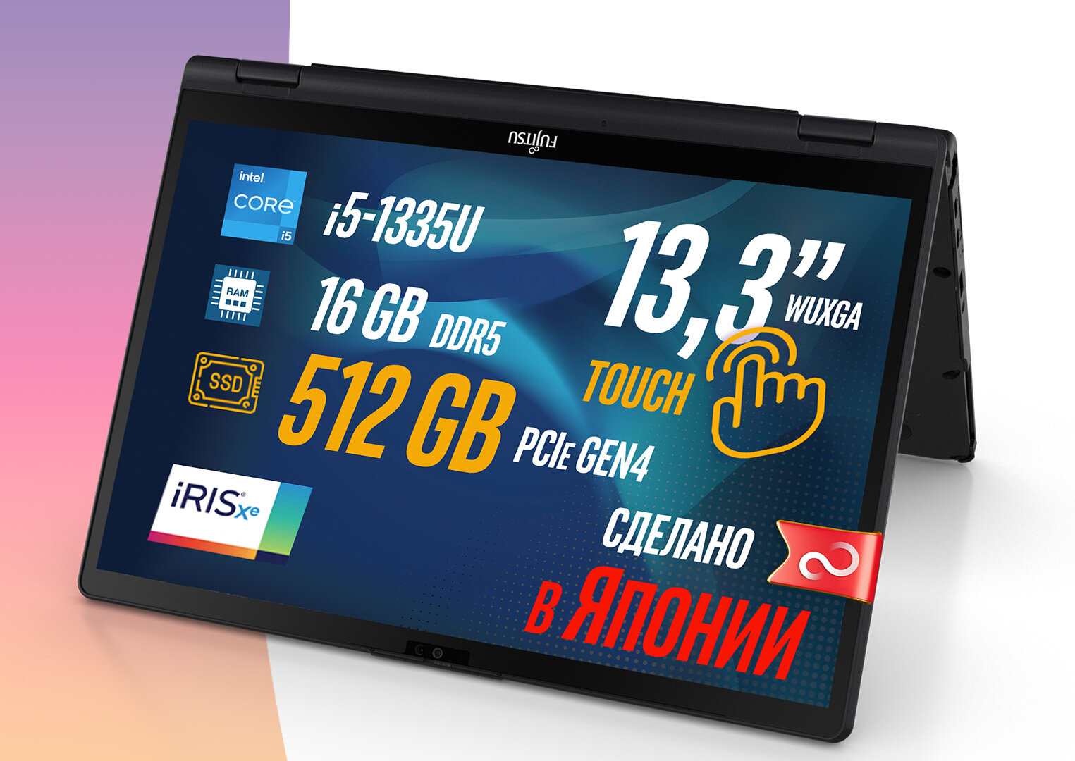 Ноутбук-трансформер Fujitsu LIFEBOOK U5313X U5313X52BRU BLACK 360°, Intel Core i5-1335U, 16GB LPDDR5-4800MHz, SSD 512GB, Intel Iris Xe Graphics, 13,3″ WUXGA Touch, WINDOWS 11 PRO, клавиатура RU/US, сделано в Японии, гарантия 1 год: сравнение цен, характеристики, фото, актуальное наличие и цены.