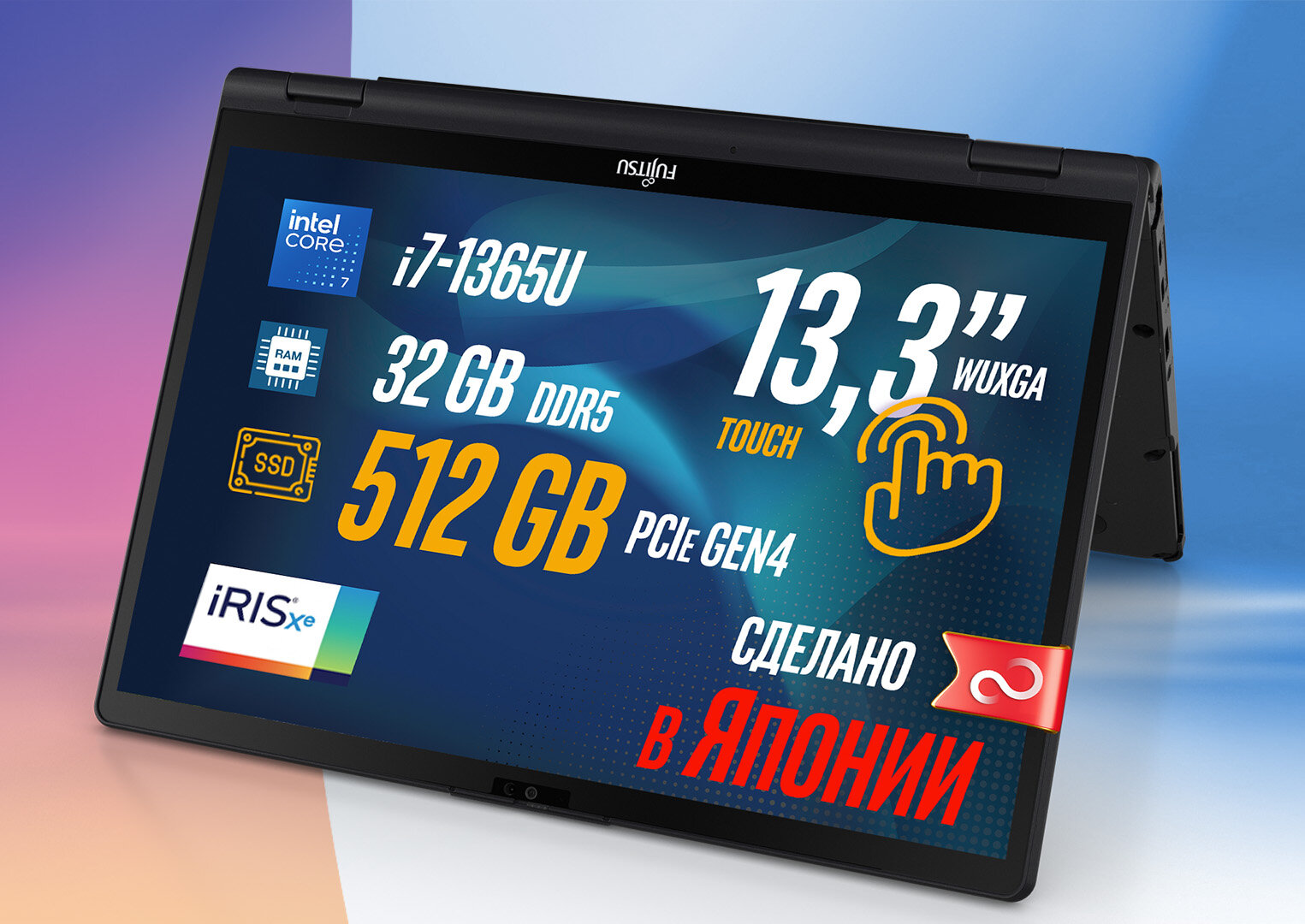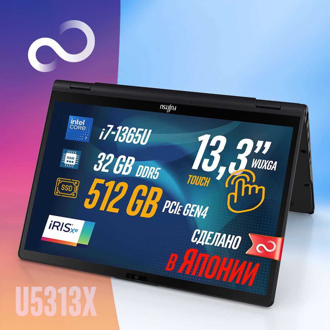 Купить Ноутбук-трансформер Fujitsu LIFEBOOK U5313X U5313X72B BLACK 360°, Intel Core i7-1365U, 32GB LPDDR5-4800MHz, SSD 512GB, Intel Iris Xe Graphics, 13,3″ WUXGA Touch, WINDOWS 11 PRO, клавиатура RU/US, сделано в Японии, гарантия 1 год с доставкой по всей России.