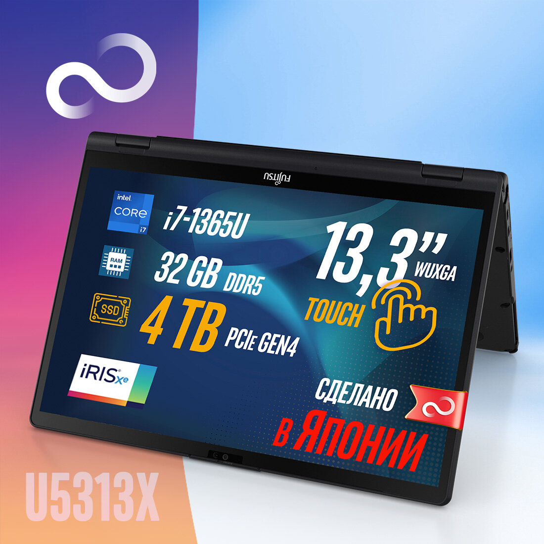 Купить Ноутбук-трансформер Fujitsu LIFEBOOK U5313X U5313X72BRU4TB BLACK 360°, Intel Core i7-1365U, 32GB LPDDR5-4800MHz, SSD 4TB, Intel Iris Xe Graphics, 13,3″ WUXGA Touch, WINDOWS 11 PRO, клавиатура RU/US, сделано в Японии, гарантия 1 год с доставкой по всей России.