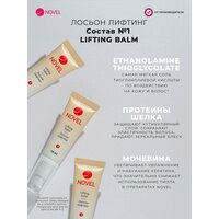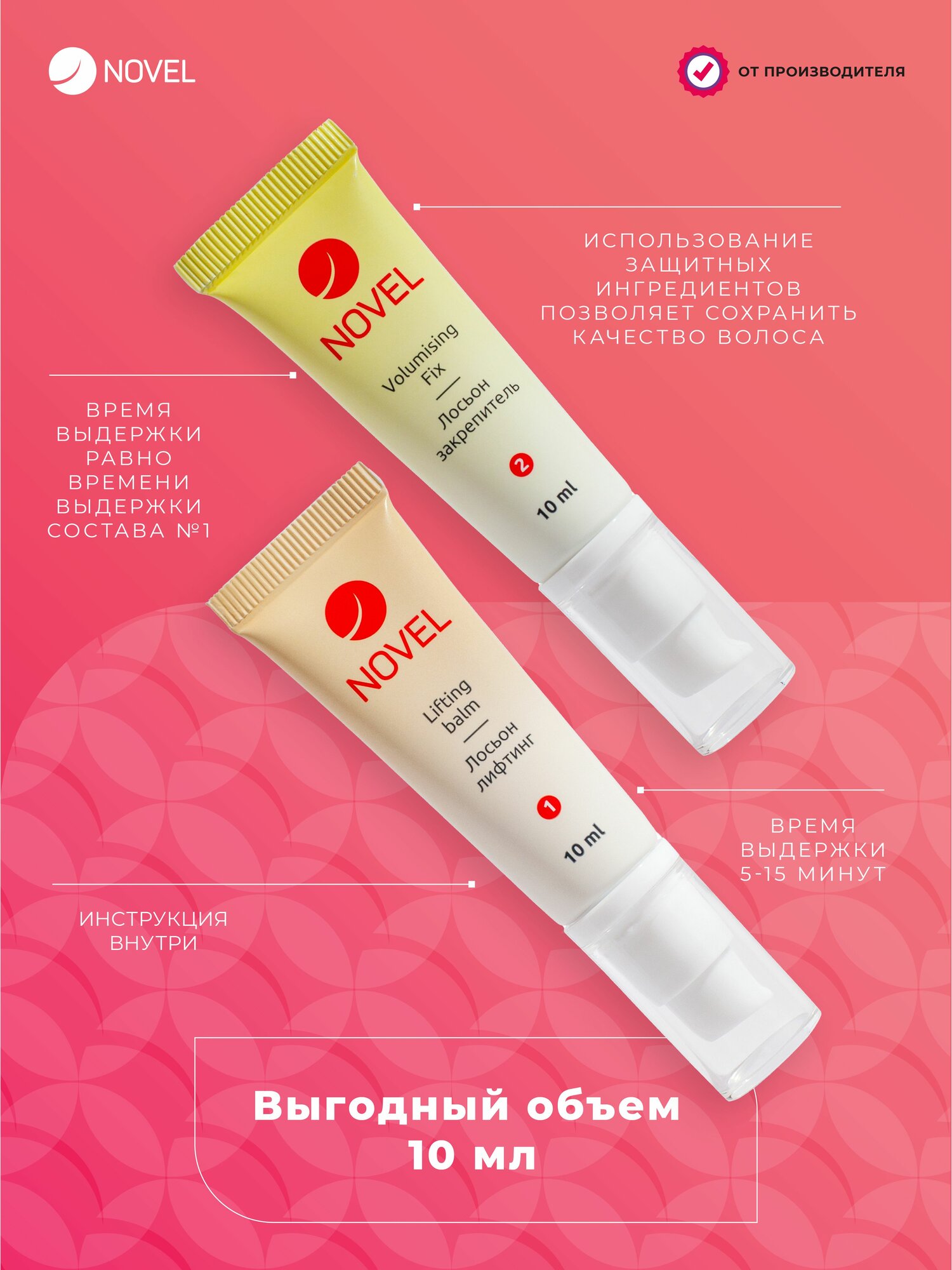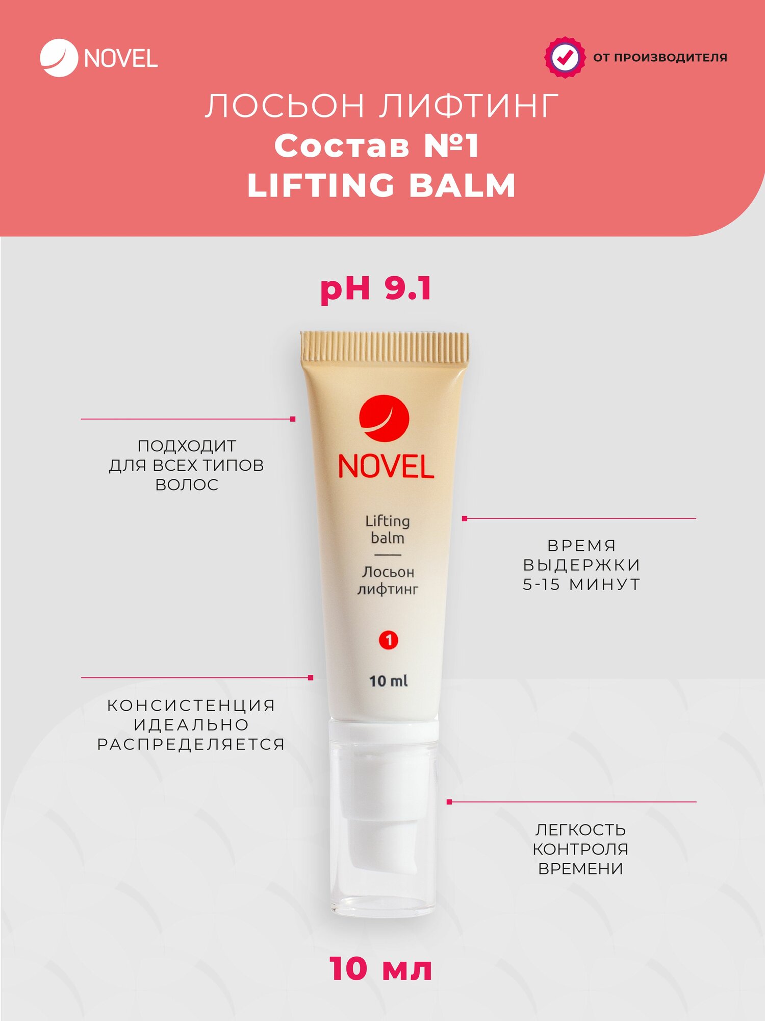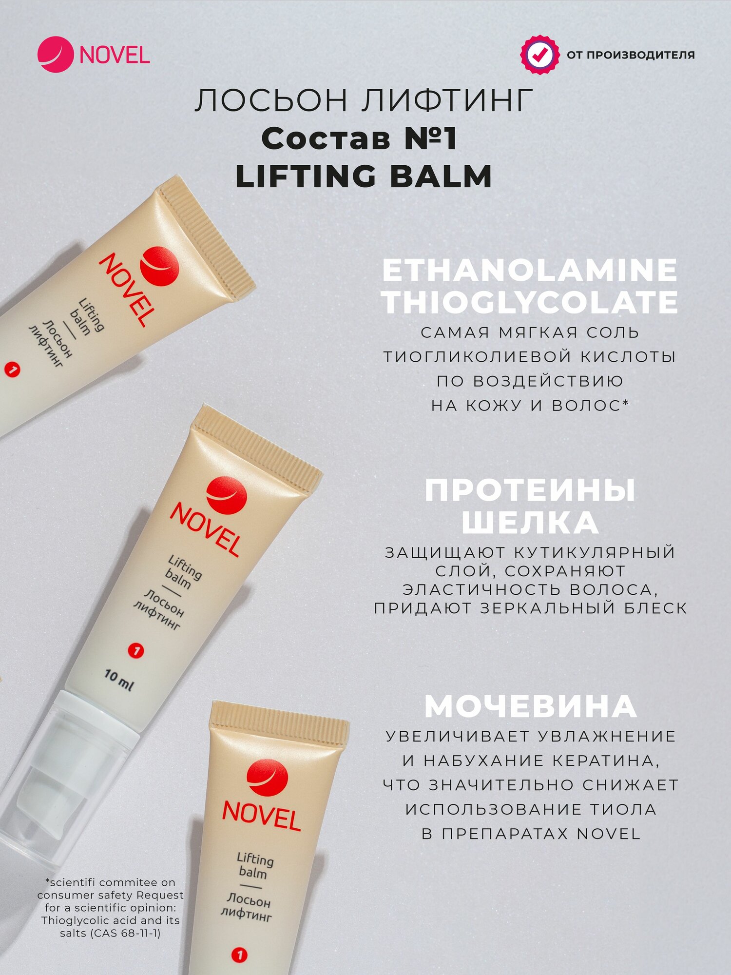 1. Лифтинг лосьон (NOVEL Lifting Balm) 10мл. - размягчает волосок, перестраивает дисульфидные связи в новом положении. Придает новую форму волоску. Время выдержки 5-15 минут.