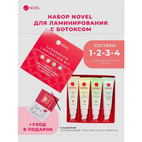 NOVEL Lifting balm - Состав 1 (Лифтинг лосьон ): Water, Ethanolamine Thioglicolate, Cetearyl Alcohol, Ammonium Thioglycolate, PEG-7 Glyceryl Cocate, Ceteareth-20, Ethanolamine, Urea, Parfum, Silk protein, Benzyl alcohol, Limonene, Linalool. NOVEL Volumizing Fix - Состав 2 (Лосьон закрепитель): Water, Cetearyl alcohol, Sodium Bromate, Ceteareth-20, Aloe barbadenis (Aloe Vera) leaf juice,Parfum, Citric Acid, Benzoic Acid. NOVEL Moisturizing Serum - Состав 3 (Увлажняющий лосьон): Aqua (Water), Glycerin, Panthenol, PEG-40 Hydrogenated Castor Oil, Hydrolyzed Keratin, Saccharomyces/Zinc Ferment, Saccharomyces/Copper Ferment, Saccharomyces/Magnesium Ferment, Saccharomyces/Iron Ferment, Saccharomyces/ Silicon Ferment, Leuconostoc/Radish Root Ferment Filtrate, Parfum (Fragrance), Xanthan Gum, Benzyl Alcohol, Ethylhexylglycerin, Tocopherol, Disodium EDTA. NOVEL Revitalizer Lashbotox - Состав 4 (Питательный лосьон): Water, Glycerin, Cetearyl Alcohol, Behenamidopropyl Dimethylamine, Dipalmitoylethyl Hydroxyethylmonium Methosulfate, Cetyl Alcohol, Polyquaternium-10, PEG-90M, Hydrolyzed Rice Protein, Carbocysteine, Serine, Glutamic Acid, Dimethicone, Amodimethicone, C11-15 Pareth-7, Laureth9, Trideceth-12,Tocopherol, Panthenol, Argania Spinosa Kernel Oil, Theobroma Macadamia Ternifolia Seed Oil, Hydrolyzed Keratin, Collagen, Hyaluronic Acid, Cetyl Hydroxyethylcellulose, Phenoxyethanol. Glyceryl Laurate, Fragrance, Citric Acid, Disodium EDTA. NOVEL Keratin Styling Gel Lash&Brow - Кератиновый Гель для ухода за ресницами и бровями после ламинирования: Aqua (Water),Glycerin, Panthenol, Hydrolyzed Keratin, PEG-40 Hydrogenated castor oil, Apigenin,Oleanolic Acid, Biotinoyl Tripeptide-1, Butylene Glycol, PPG-26-Buteth-26, Parfum (Fragrance), Carbomer, Benzyl Alcohol, Ethylhexylglycerin, Tocopherol, Disodium EDTA