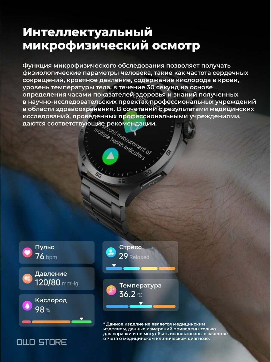 Представляем вам новинку 2024 года — умные часы "Монитор здоровья". Эти смарт часы являются идеальным помощником для тех, кто заботится о своем здоровье. Благодаря встроенным датчикам, вы сможете контролировать уровень сахара в крови, измерять холестерин и отслеживать состояние сердца с помощью функции ЭКГ. Часы также оценят ваш уровень стресса, что поможет вам уделять больше внимания своему эмоциональному состоянию. Умные часы имеют стильный металлический дизайн, что делает их отличным аксессуаром для любого образа. В сочетании с металлическим браслетом, они обеспечивают как комфорт, так и элегантный внешний вид. Эти часы сочетают в себе современные технологии и изысканный стиль, подходящий как для повседневной носки, так и для особых случаев. С AMOLED дисплеем вы сможете наслаждаться яркими и четкими изображениями, обеспечивая легкость чтения информации даже при ярком солнечном свете. Воды этого гаджета обеспечит длительное время автономной работы благодаря аккумулятору ёмкостью 380 mAh, что гарантирует использование устройства в течение долгого времени без необходимости частой подзарядки. Другим полезным дополнением является кнопка SOS, позволяющая в экстренных ситуациях мгновенно обратиться за помощью. Умные часы подходят как для женщин, так и для мужчин и идеально подойдут для активных людей, стремящихся следить за своим здоровьем и получать актуальные данные о состоянии организма. Не упустите возможность стать владельцем этих умных часов, которые не только станут стильным аксессуаром, но и обеспечат вас важной информацией о состоянии вашего здоровья. Умные часы "Монитор здоровья" — это ваш надежный спутник на пути к здоровому образу жизни. Преимущества часов: 1,43-дюймовый полностью сенсорный экран AMOLED с разрешением 466*466, вызов Bluetooth, электрокардиограмма ЭКГ, функция микрофизического обследования, обнаружение ВСР, обнаружение эмоций, обнаружение усталости, неинвазивный мониторинг уровня сахара в крови, измерение компонентов крови. (функция мочевой кислоты и липидов в крови), измерение ИМТ в организме, функция Meteoron, функция экстренного вызова SOS, мониторинг кислорода в крови, мониторинг артериального давления, тренировка дыхания, здоровье женщин (отслеживание менструального цикла), мониторинг сердечного ритма, мониторинг сна, напоминание о сидячем положении, и т. д. Подсчет шагов/калорий/расстояния, мульти спортивный режим, будильник, функция отображения экрана, прогноз погоды, интеллектуальный голосовой помощник, игры, фонарик, воспроизведение музыки и управление. Приложение: Hband, Hband2, Gband