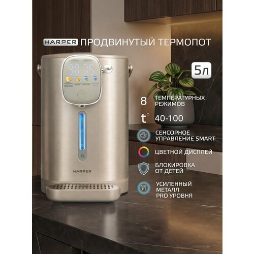 Новинка 2026! Термопот электрический 5л с поддержанием температуры Harper HTP-5T02 – это вместительный, функциональный, а главное, очень полезный прибор для любой кухни и офиса. Он обеспечивает наличие большого запаса воды нужной температуры и поддерживает сразу несколько режимов работы: