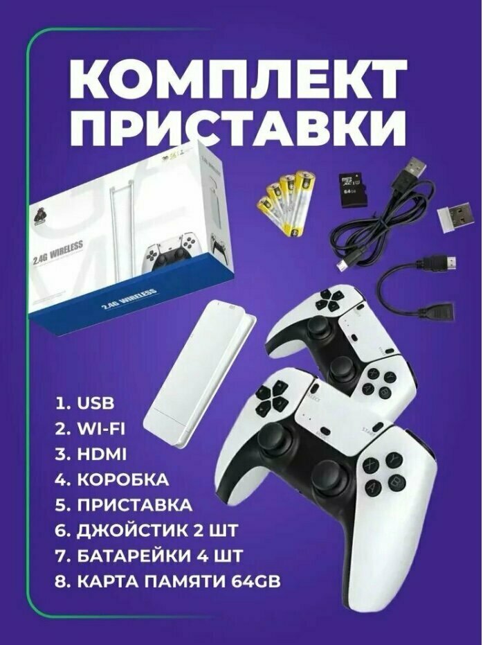 | Подробная комплектация | Приставка игровая, 2 геймпада, карта памяти microSD, адаптер для работы джойстиков, удлинитель HDMI, шнур MicroUSB, инструкция, коробка. |