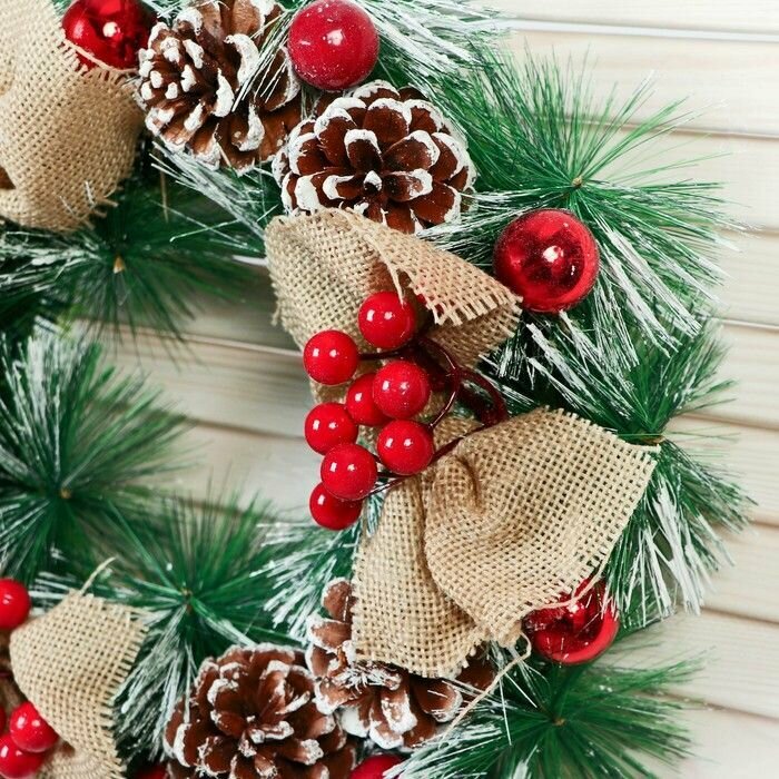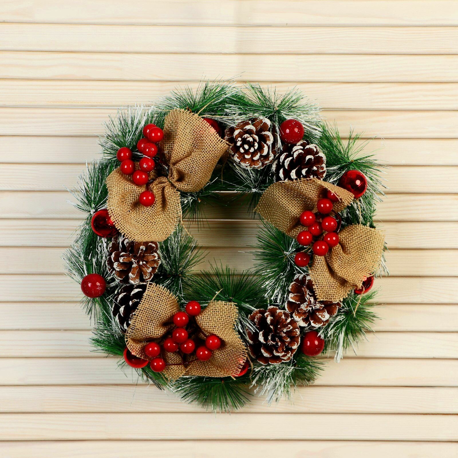 Новогодний венок «Уютная сказка» 26 см, зелёный заснеженный уличный венок с шишками и ягодами, рождественское декоративное украшение с белым напылением на дверь для дома