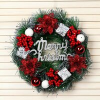 Новогодний венок "Уютная сказка" 26 см, зелёный заснеженный уличный венок с ягодами и шарами, рождественское декоративное украшение с белым напылением на дверь для дома