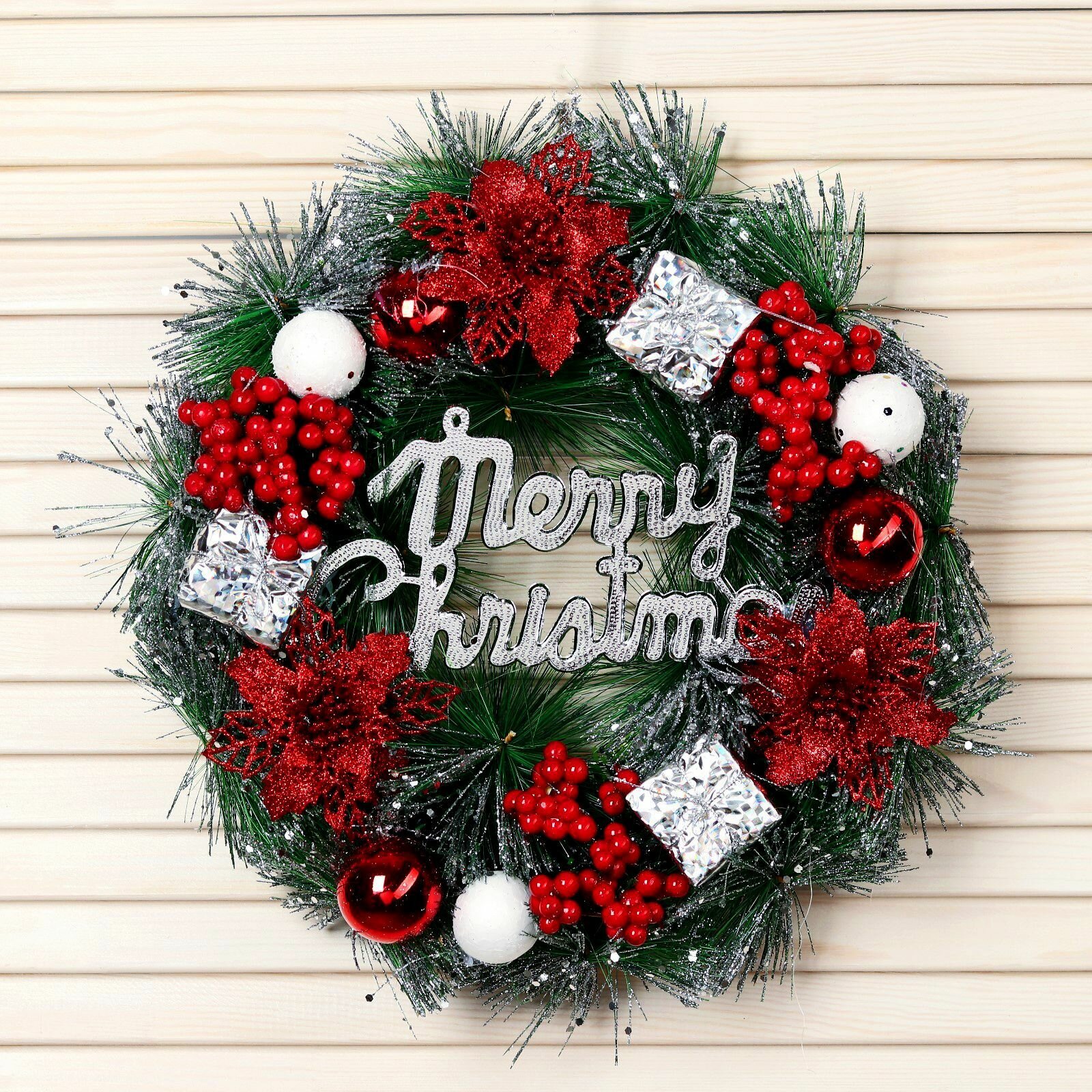Новогодний венок «Уютная сказка» 26 см, зелёный заснеженный уличный венок с ягодами и шарами, рождественское декоративное украшение с белым напылением на дверь для дома