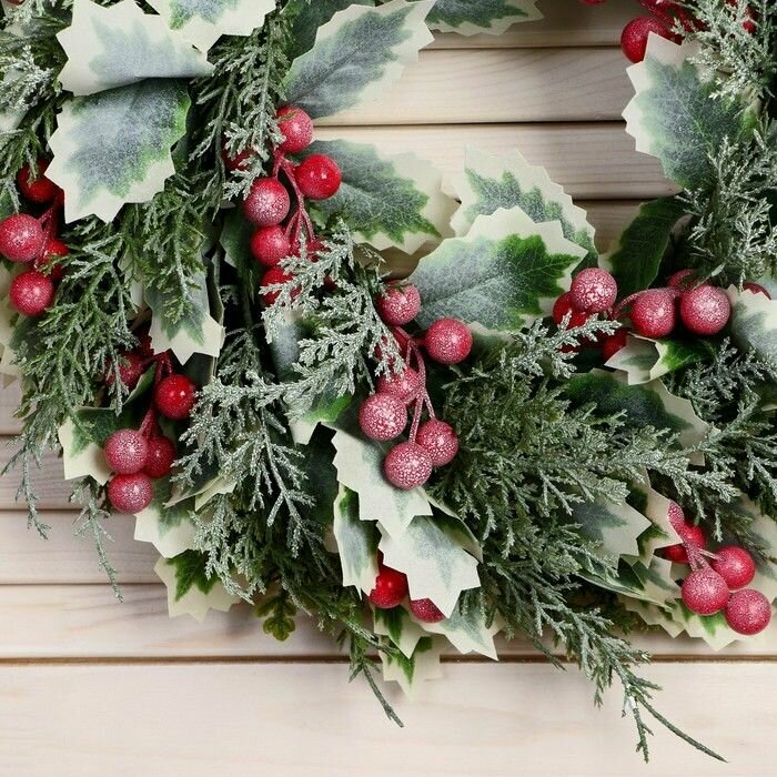 Новогодний венок "Уютная сказка" 33 см, зелёный заснеженный уличный венок с ягодами и листочками, рождественское декоративное украшение с белым напылением на дверь для дома