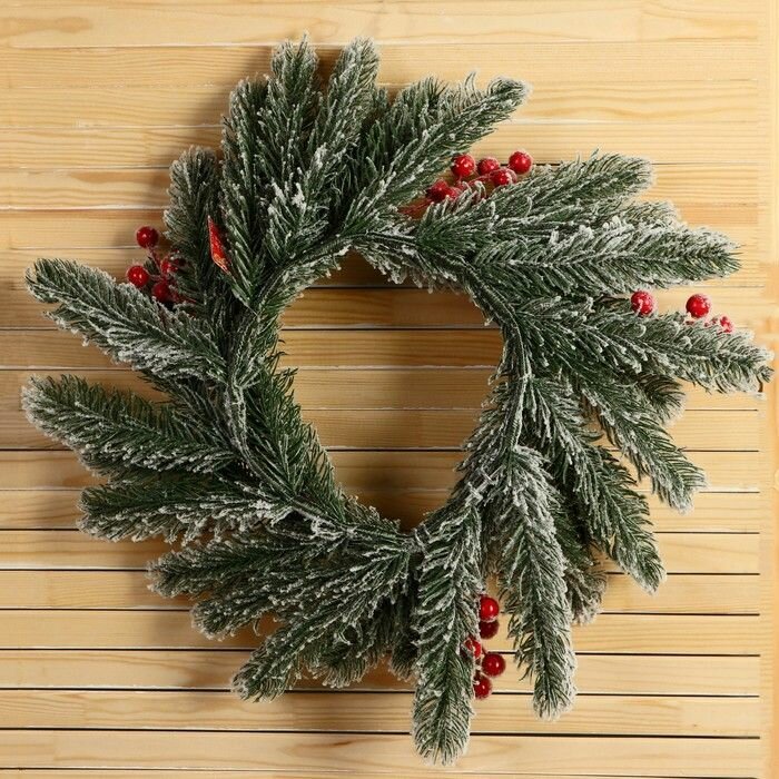 Новогодний венок "Уютная сказка" 33 см, зелёный заснеженный уличный венок с ягодами, рождественское декоративное украшение с белым напылением на дверь для дома
