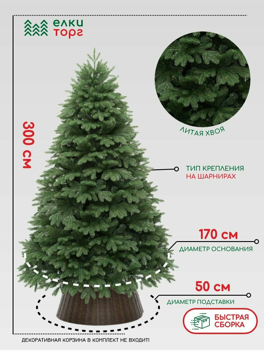 Ель Парижанка 300 см, литая хвоя+пвх, ЕлкиТорг (111300) - классическая искусственная ель премиум-класса, которая производится по уникальной технологии с использованием двух видов хвои: литая и PVC, такие елочки еще называют смешанными. Веточки из литой хвои в точности имитируют настоящее дерево, они приятные на ощупь, пушистые, иголочки нежные и совсем не колются, такие веточки расположены на краях ветвей и если отойти на три метра от ели, то отличить ее от натуральной будет практически невозможно. Внутри, ближе к основанию, пространство заполнено другим видом мягкой хвои - ПВХ, оно служит для придания пышности и внутреннего объема.