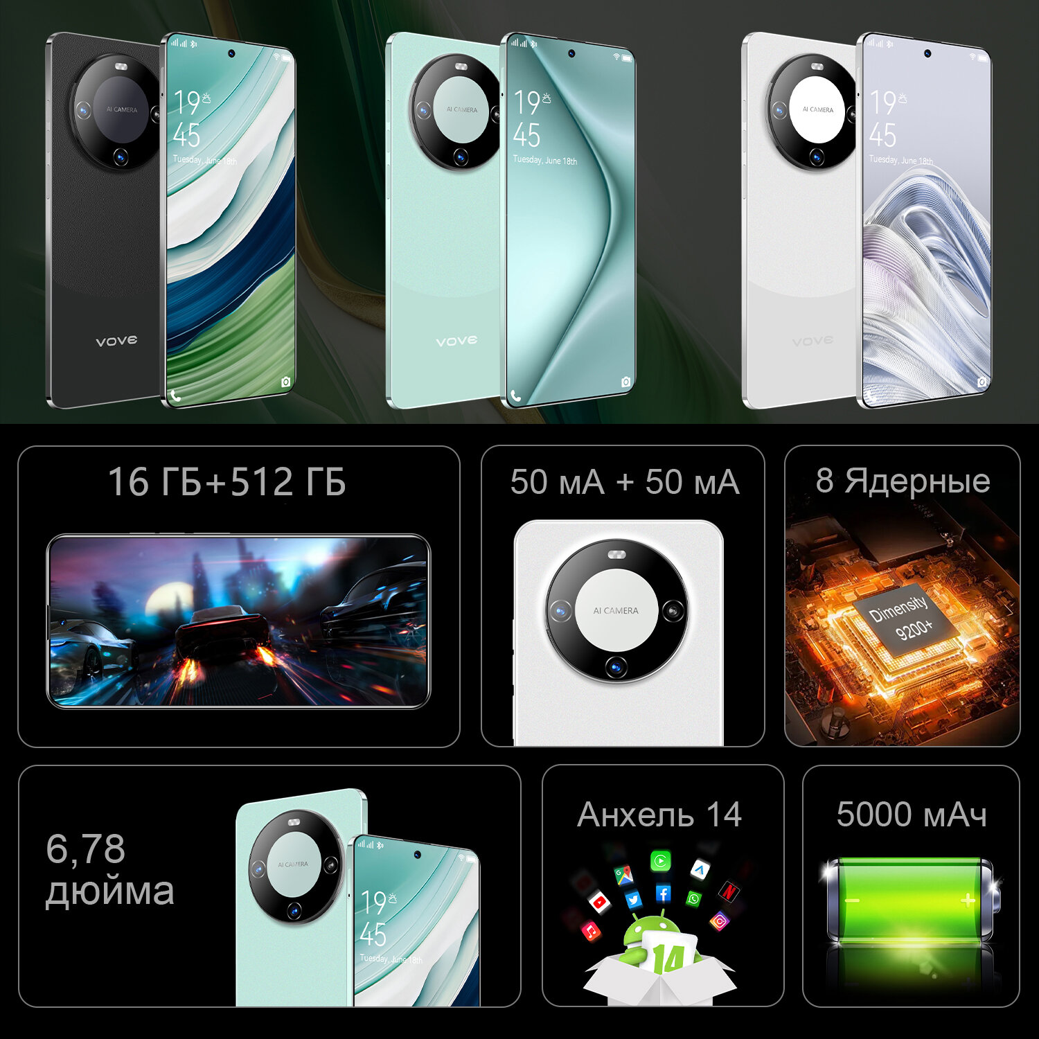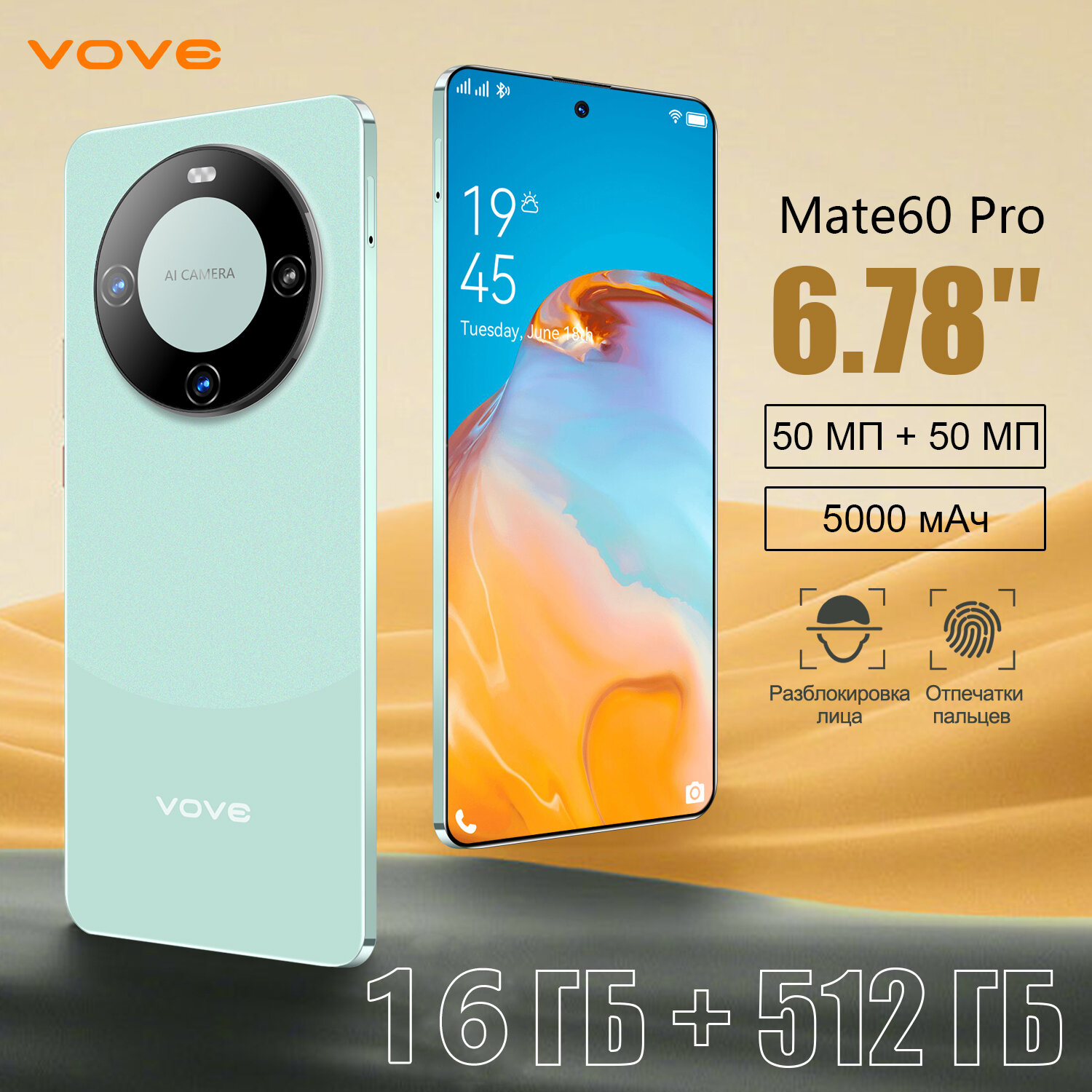 Новый смартфон Mate60 Pro, высокая конфигурация, русская версия, 6.78, Android 14, 5G, 16/256 ГБ, зеленый