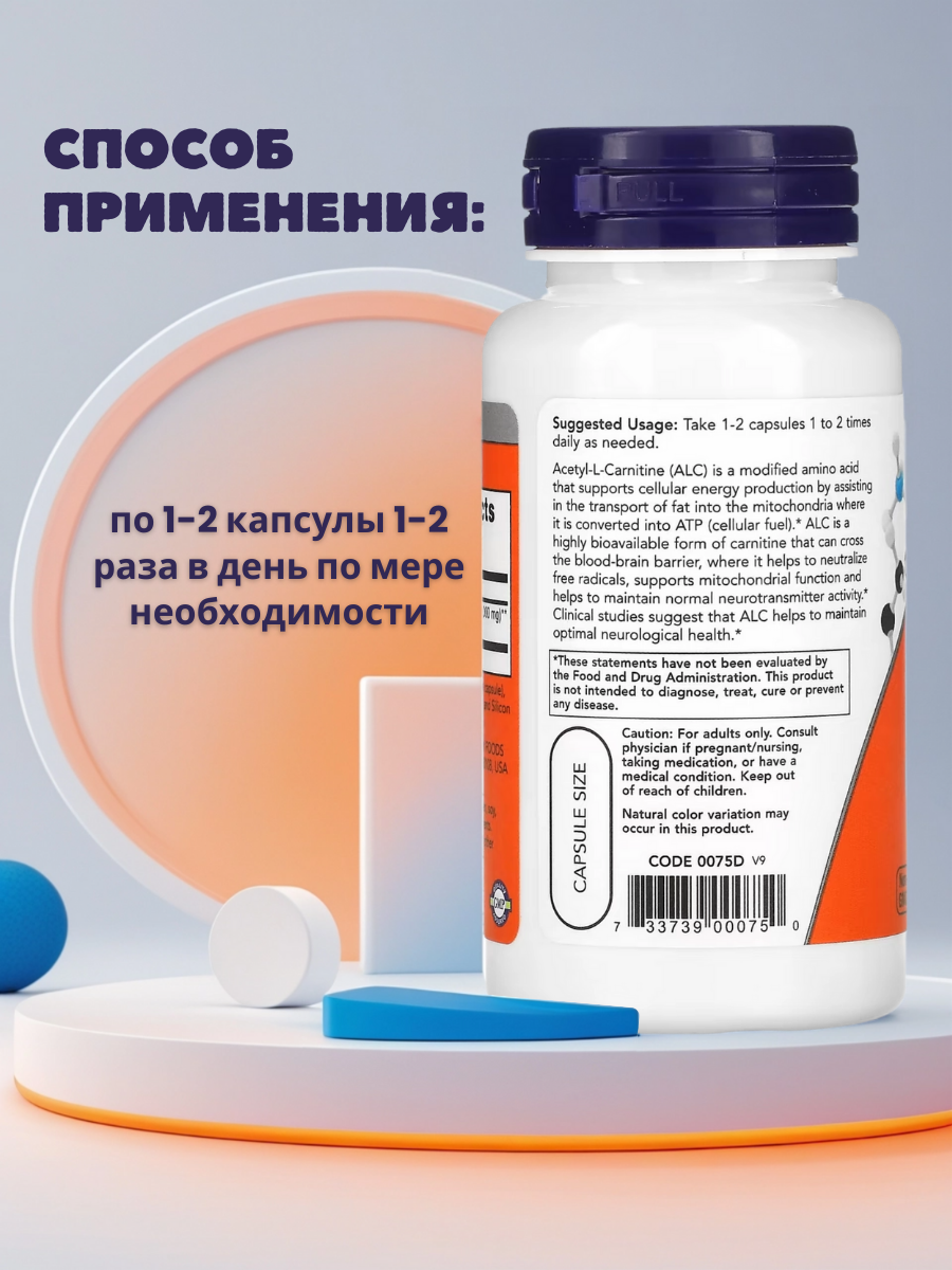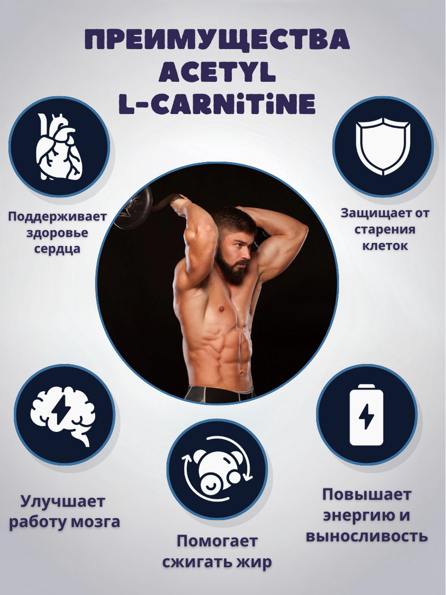 | Дополнительная информация | состав: ацетил-L-карнитин – 500мг, целлюлоза, стеариновая кислота, стеарат магния.; рекомендации по применению: 1-2 капсулы 1-2 раза в день. |
