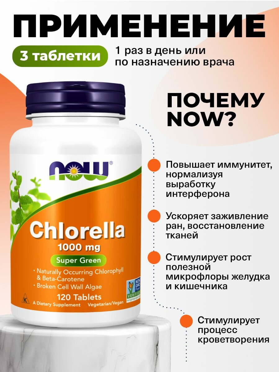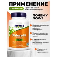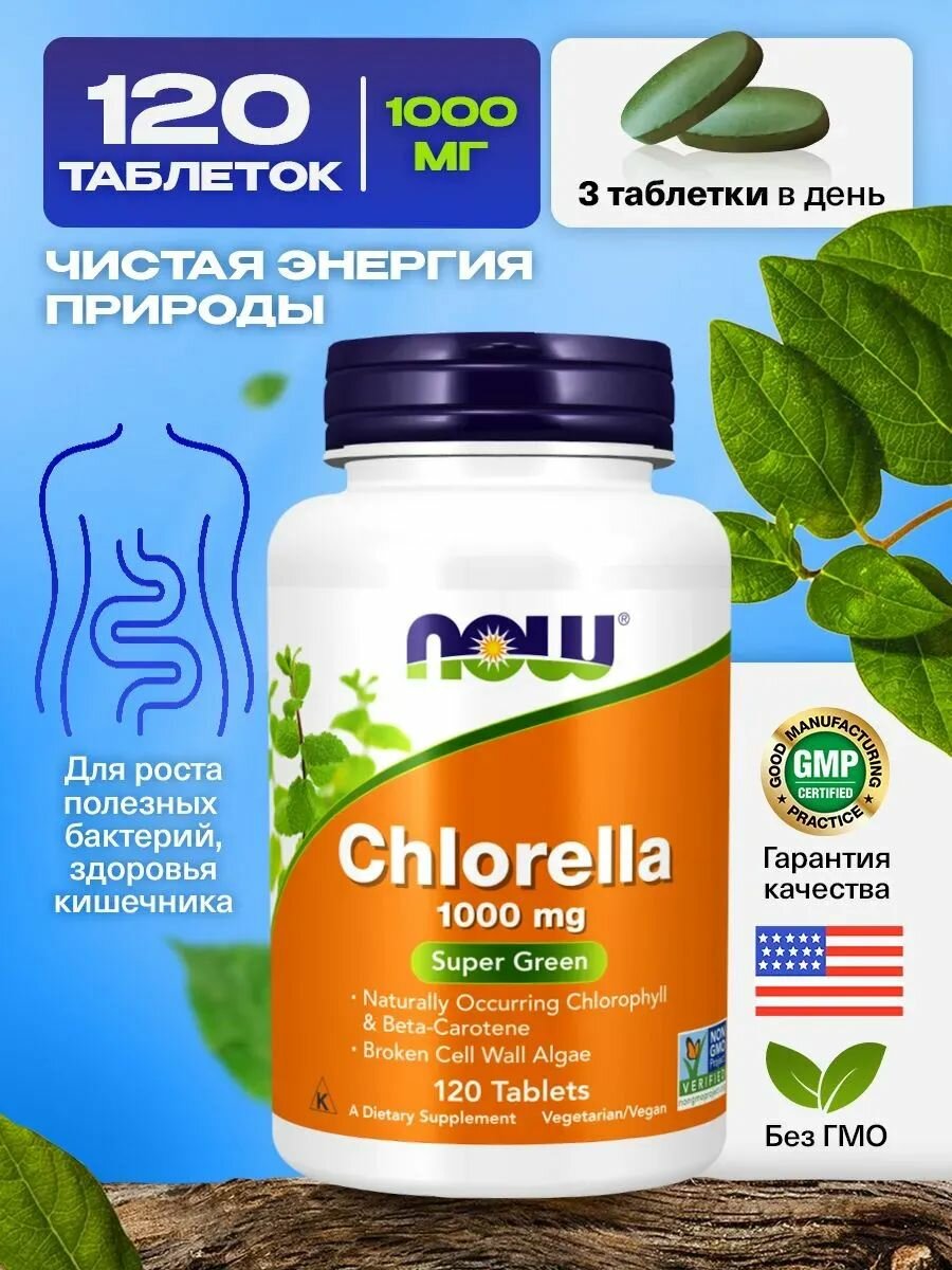NOW Chlorella 1000mg, Хлорелла, 120 таблеток, для кишечника, для желудка, для иммунитета взрослым, детокс
