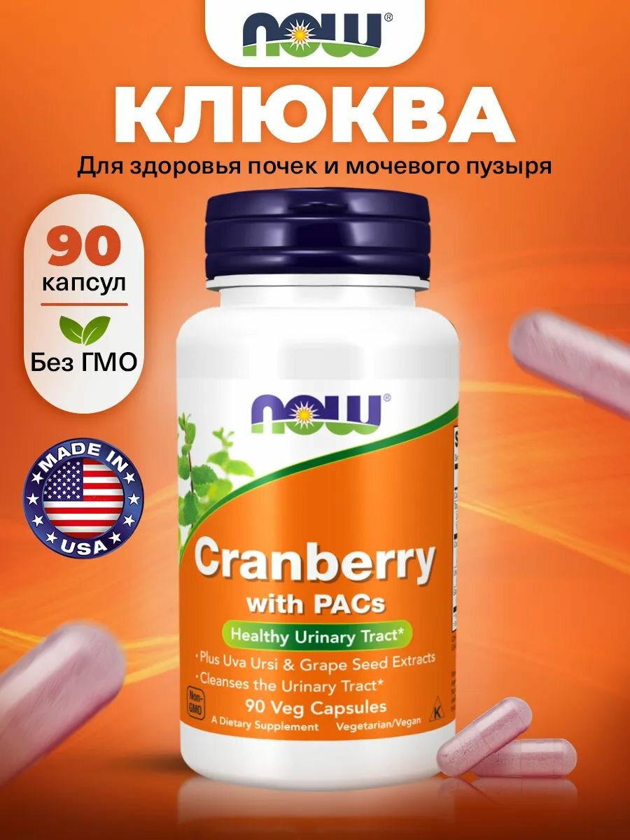 NOW Cranberry with PACs, Клюква, 1000 мг, 90 капсул, для почек, мочегонное, от цистита, антиоксидант, для иммунитета