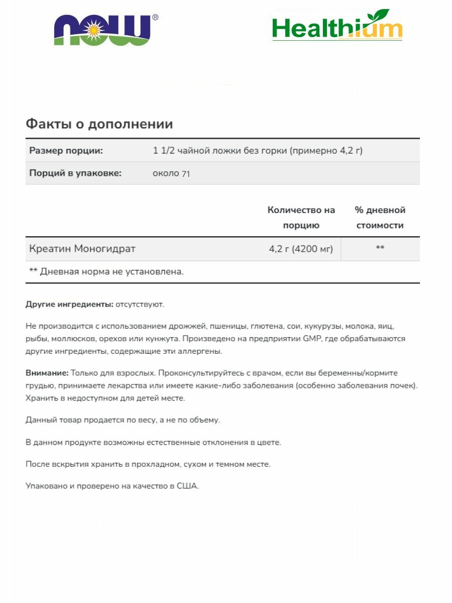 NOW Foods, Sports, Creatine Monohydrate Micronized, Бад микронизированный моногидрат креатина, 500 гр. Креатин - это соединение, которое естественным образом содержится в организме, в первую очередь в скелетных мышцах. Функция пищевой добавки нау креатин заключается в том, чтобы служить предшественником аденозинтрифосфата (АТФ), формы химической энергии, используемой всеми клетками. Запасы креатина нау в организме создают резерв легкодоступной АТФ для получения энергии, которая необходима для быстрого роста силы и выносливости. Исследования показали, что витаминный комплекс креатин могут помочь сохранить существующую мышечную ткань, поддержать рост и развитие мышечной массы и способствовать оптимальной производительности во время коротких интенсивных тренировок. Свойства спортпит креатина: способствует увеличению мышечной силы и выносливости; поддерживает фосфорный и водный баланс в мышцах; ускоряет восстановление организма после тренировок; стимулирует рост сухой мышечной массы; спортивное питание нау фудс ускоряет топку жира и увеличивает рельеф; увеличивает производство АТФ. Рекомендации по применению Смешайте 1,5 чайной ложки без горки с фруктовым соком или другой подслащенной жидкостью 3–4 раза в день и принимайте до и после тренировки в течение первых 7 дней. После этого для поддерживающего использования принимайте от 1 до 3 раз в день. Временной интервал между приемами должен составлять от 3 до 4 часов. При непрерывном приеме более 28 дней ограничьте дозу одной порцией в день. Увеличьте потребление жидкости во время приема продукта.