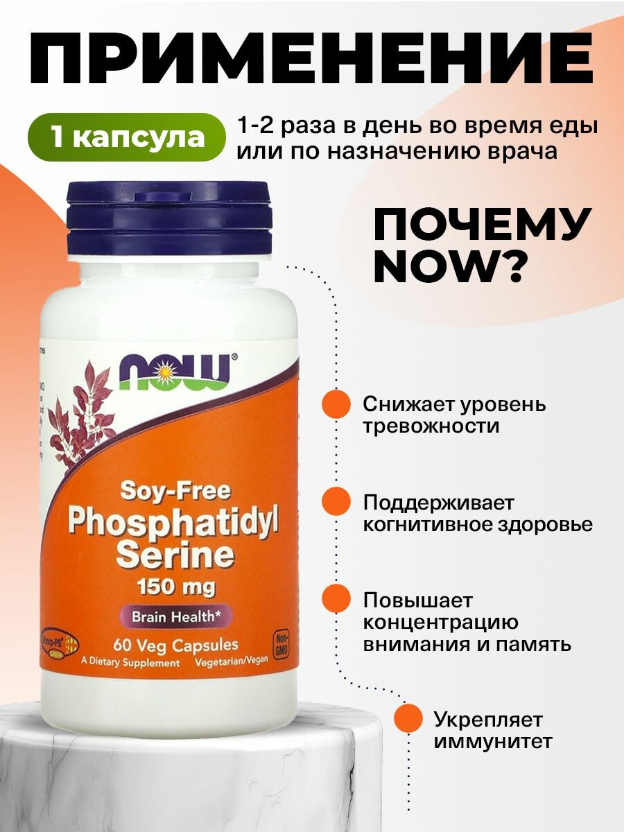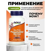 NOW Phosphatidyl Serine Soy-Free, Фосфолипид (фосфатидилсерин), 150мг 60 растительных капсул, Антиоксидант для мозга, памяти, когнитивных функций, без сои: сравнение цен, характеристики, фото, актуальное наличие и цены.