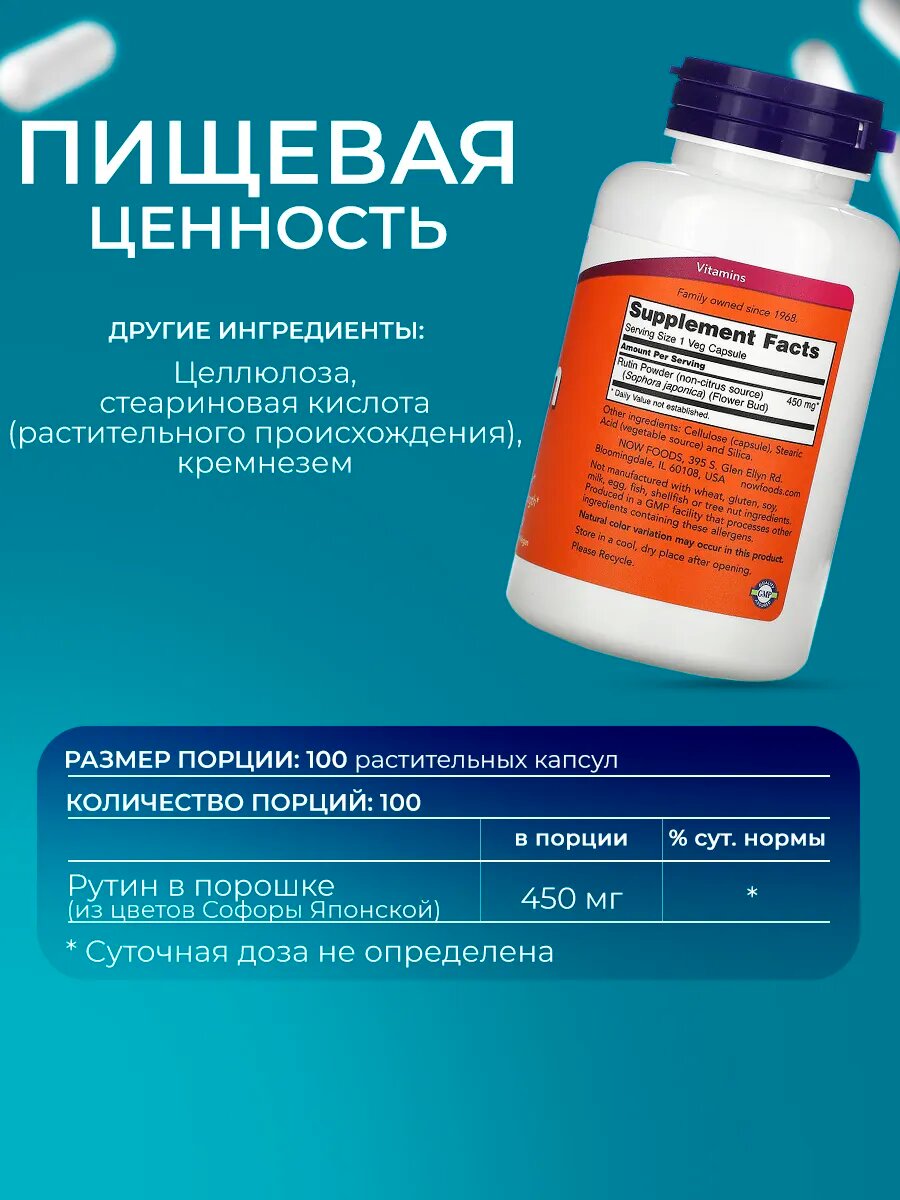 Купить NOW Rutin 450мг 100 капсул Рутин Нау с доставкой по всей России. NOW Rutin 450мг 100 капсул Рутин Нау: сравнение цен, характеристики, фото, актуальное наличие и цены.