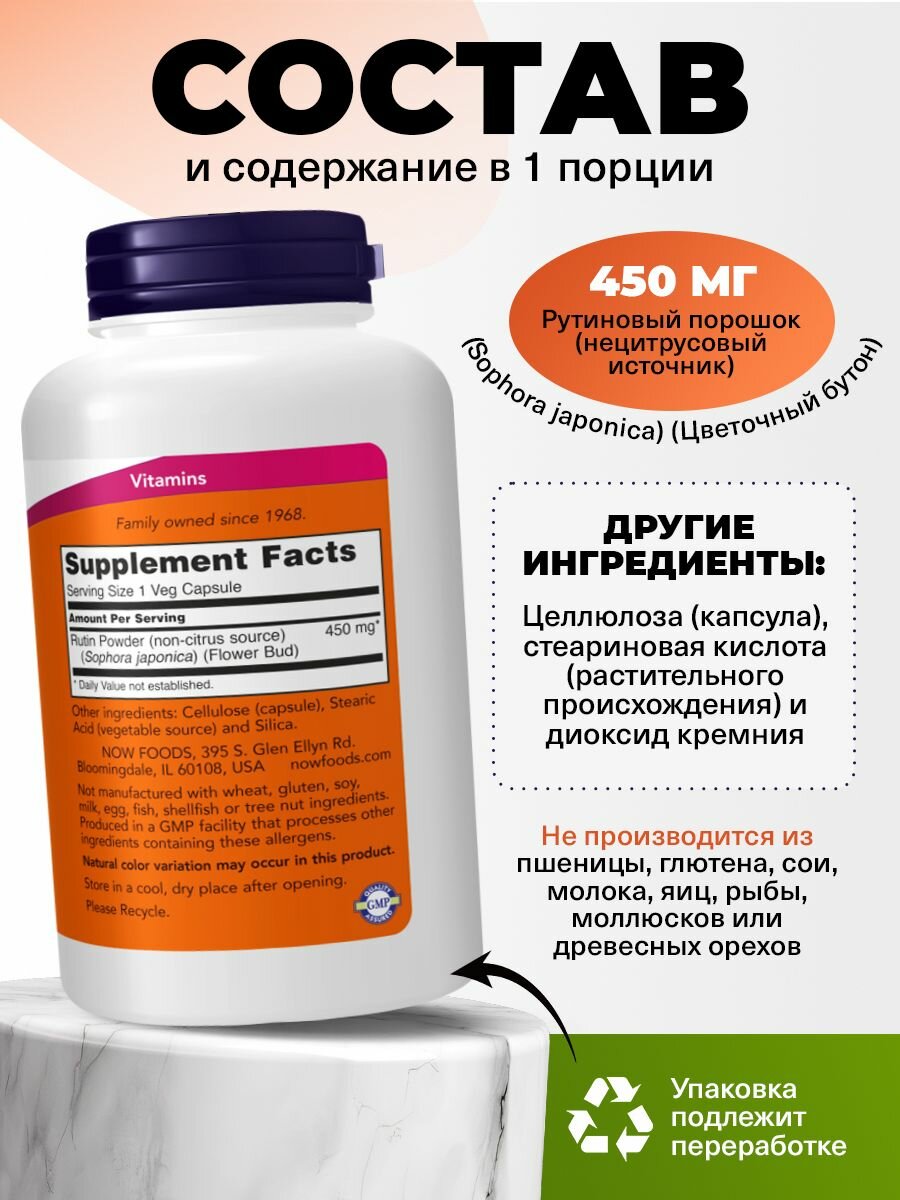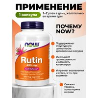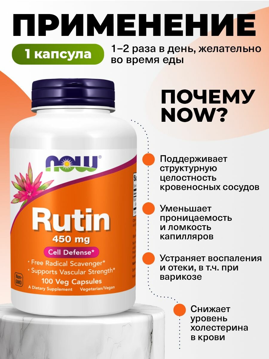 NOW Rutin, Рутин, 450мг 100 растительных капсул, Антиоксидант, биофлавоноид, для сердца и сосудов, от отеков: сравнение цен, характеристики, фото, актуальное наличие и цены.