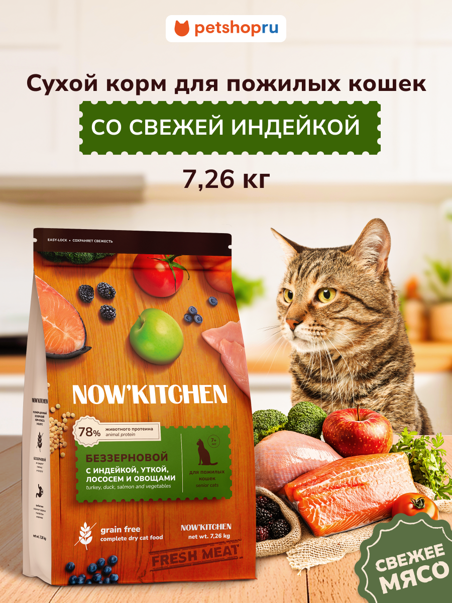 NOW’KITCHEN беззерновой сухой корм для кошек старше 7 лет со свежей индейкой, уткой, лососем, Senior Grain-free Recipe, Turkey, Duck, Salmon, 7,26 кг: сравнение цен, характеристики, фото, актуальное наличие и цены.