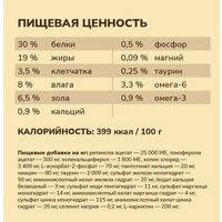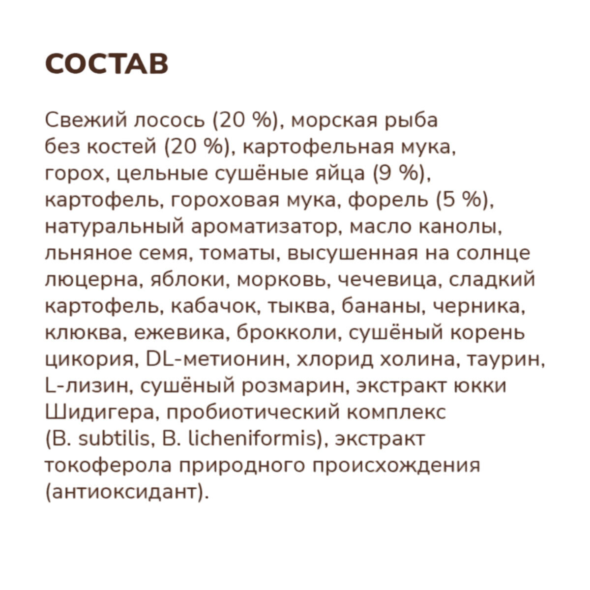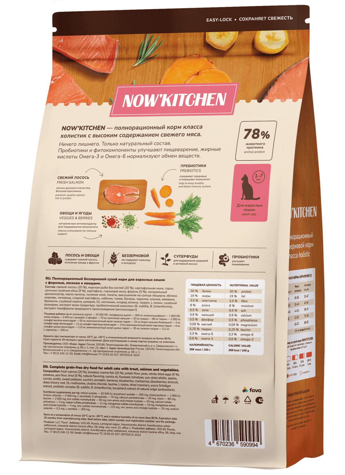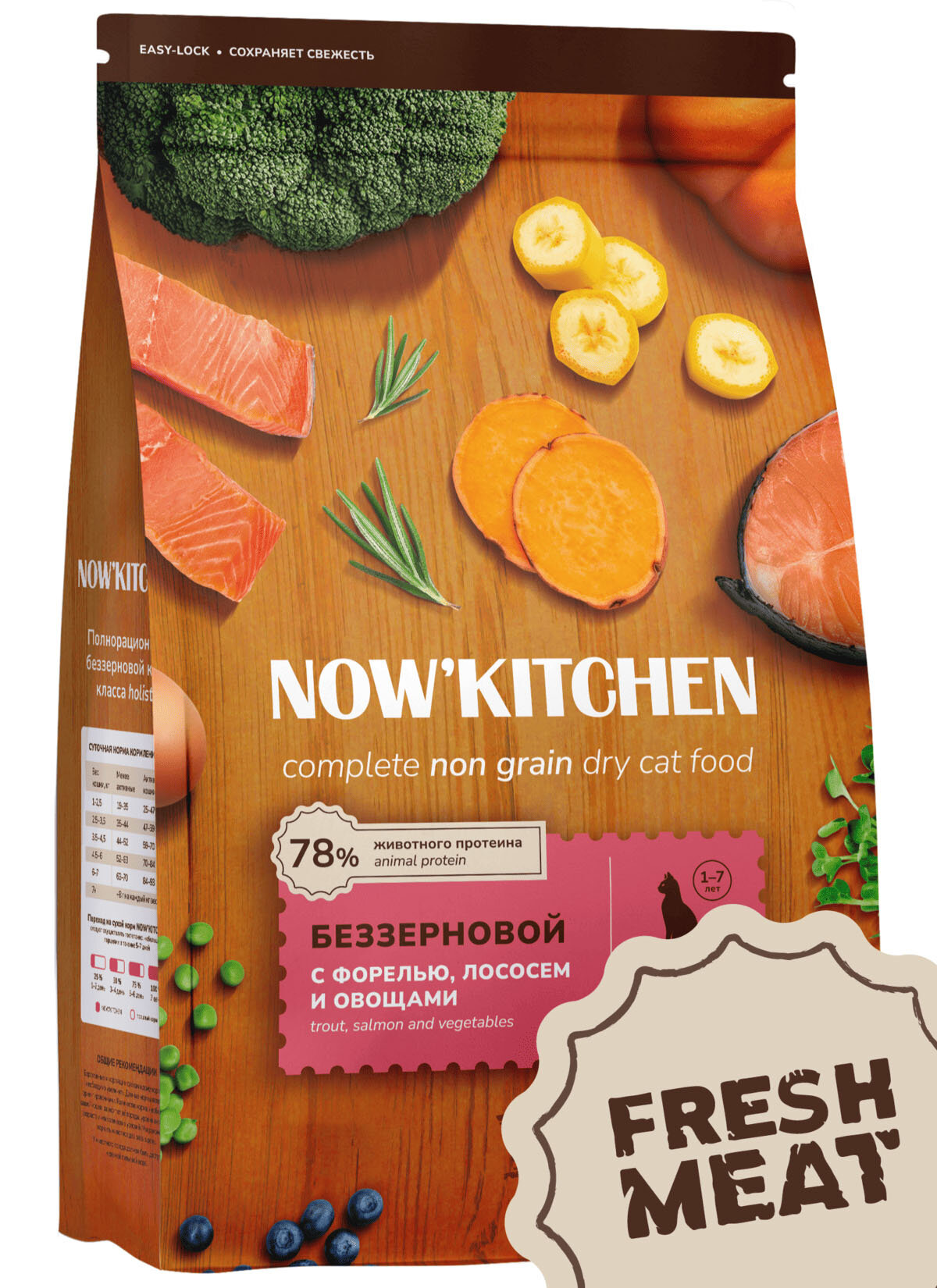NOW'KITCHEN для взрослых кошек изготовлен из 100% свежей форели, лосося, сельди.Содержит только свежее мясо (т.е. питомец получает белок высокого качества, который быстро усваивается организмом). Первый беззерновой корм со сбалансированным содержанием белков и жиров Содержит пре- и пробиотики, антиоксиданты, а также жизненно необходимые кислоты омега-3 и омега-6Не содержит: мясной муки субпродуктов, красителей и гормонов роста глютена говядины пшеницы, кукурузы, сои.Ингредиенты: свежее филе форели, картофель, горох, цельные сушеные яйца, картофельная мука, гороховая мука, натуральный ароматизатор, рапсовое масло, льняное семя, кокосовое масло, свежее филе лосося, свежее филе сельди, карбонат кальция, хлорид натрия, томат, люцерна, яблоки, морковь, тыква, сладкий картофель, кабачок, бананы, черника, клюква, ежевика, гранат, папайя, чечевица, брокколи, фосфорная кислота, DL-метионин, холин хлорид, сушеный корень цикория, таурин, витамины (витамин E, ниацин, L-аскорбил-2-полифосфат (источник витамина С), мононитрат тиамина, биотин, витамин A, пантотенат d-кальция, бета-каротин, рибофлавин, пиридоксин гидрохлорид, витамин B12, витамин D3, фолиевая кислота), минералы (протеинат цинка, сульфат железа, оксид цинка, протеинат железа, сульфат меди, селенит натрия, протеинат меди, протеинат марганца, оксид марганца, йодат кальция), сушеный продукт ферментации Lactobacillus acidophilus, сушеный продукт ферментации Enterococcus faecium, L-лизин, хлорид калия, L-карнитин, сушеный розмарин.Калорийность: 3895 ккал/кг или 428 ккал/порция (250 мл).