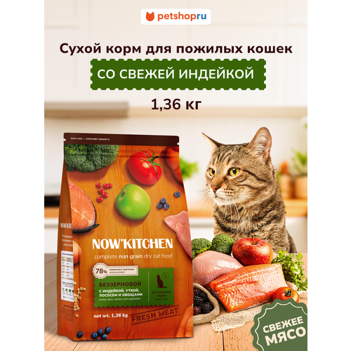 NOW'KITCHEN для пожилых кошек с индейкой, уткой, лососем и овощами - выбор заботливых владельцев, желающих обеспечить пожилым питомцам полноценное и сбалансированное питание в том возрасте, когда поддерживать их организм особенно важно. Этот корм разработан с учетом особенных потребностей пожилых кошек и помогает поддерживать активность и крепкое здоровье.
