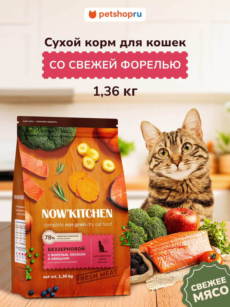 NOW’KITCHEN беззерновой сухой корм для взрослых кошек со свежей форелью, лососем и овощами, Adult Grain-free Recipe, Trout, Salmon, 1.36кг: сравнение цен, характеристики, фото, актуальное наличие и цены.