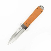 Нож Adimanti by Ganzo Samson – это компактный флиппер, чей клинок надежно запирается в открытом и закрытом положениях. Рукоять инструмента имеет стальную основу с двумя текстурированными накладками из G10 – прочного стеклотекстолита, который высоко ценится за свою стойкость к ударам и механическим повреждениям. В отличие от дешевого пластика, на стеклотекстолите не образовываются микротрещины после продолжительного воздействия низких температур. Материал также не деформируется в случае долгого нахождения под прямыми лучами солнца, не выцветает и не скользит в ладони.