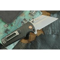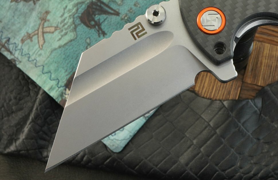 Форма клинка — Wharncliffe, в данном случае не слишком пригодная для шинковки на кухонной доске. Из-за сильно выступающего плавника нож будет резать острым кончиком, не задействуя всю РК. Зато им можно удобно строгать, вскрывать упаковки, радовать себя и эпатировать окружающих. Есть дулька, заметно облегчающая процесс заточки, а на насечку на обухе очень удобно ложится большой палец при диагональном хвате. Клинок модели 1820P-CF выполнен в инструментальной стали D2. Это «полунержавейка» с содержанием хрома недостаточным, чтобы считаться полноценной коррозионно-стойкой сталью (необходим минимальный уход). Зато благодаря высокому содержанию углерода она прекрасно режет, имеет высокую твёрдость/вязкость и удерживает заточку даже после серьезных нагрузок.