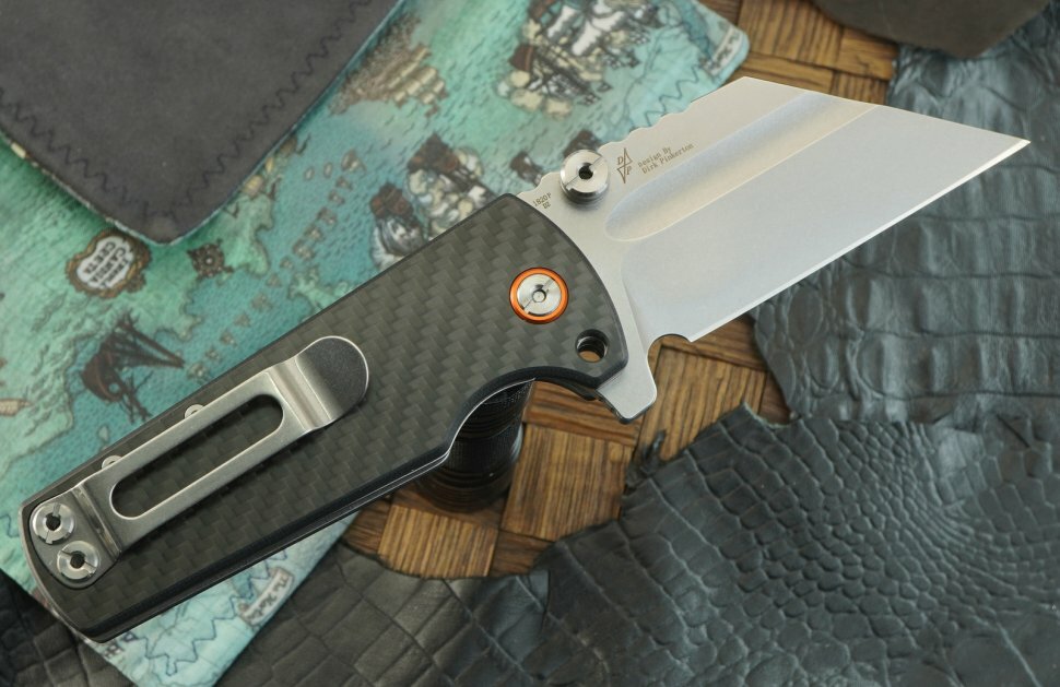 Нож открывается за плавник, симметричные шпеньки, зацепом за широкий дол и даже просто инерционно. Осевой узел выполнен на подшипниках с керамическими шариками, механика прекрасная, клин просто «летает». Замок — классический, интуитивно понятный Liner Lock. А если в разложенном виде ввинтить пин в специальное отверстие, нож станет фикседом. Рукоять модели 1820P-CF сформирована полнопрофильными стальными лайнерами с накладками из карбона. Это очень лёгкий и прочный материал с красивым рисунком, образованным плетением нитей углеродного волокна. Конструкция получилась открытая и продуваемая. Клипса двухпозиционная, переставляемая под правую/левую руку.