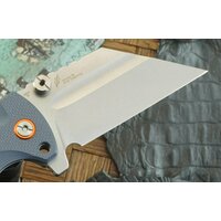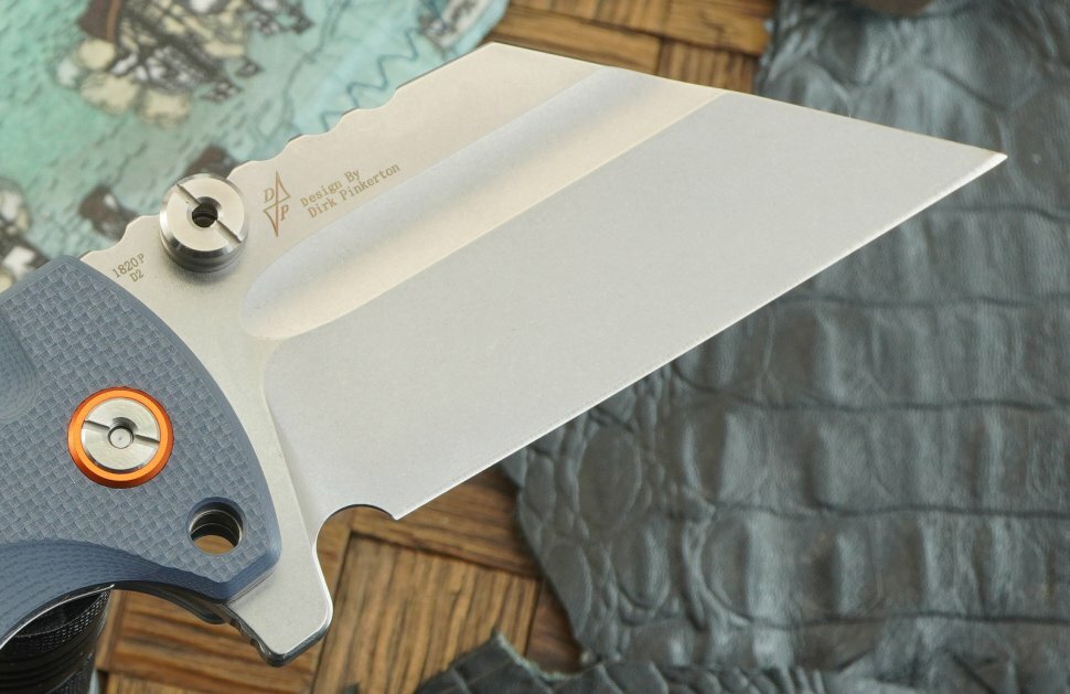 Форма клинка — Wharncliffe, в данном случае не слишком пригодная для шинковки на кухонной доске. Из-за сильно выступающего плавника нож будет резать острым кончиком, не задействуя всю РК. Зато им можно удобно строгать, вскрывать упаковки, радовать себя и эпатировать окружающих. Есть дулька, заметно облегчающая процесс заточки, а на насечку на обухе очень удобно ложится большой палец при диагональном хвате. Клинок модели 1820P-GYF выполнен в инструментальной стали D2. Это «полунержавейка» с содержанием хрома недостаточным, чтобы считаться полноценной коррозионно-стойкой сталью (необходим минимальный уход). Зато благодаря высокому содержанию углерода она прекрасно режет, имеет высокую твёрдость/вязкость и удерживает заточку даже после серьезных нагрузок.