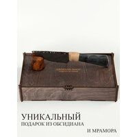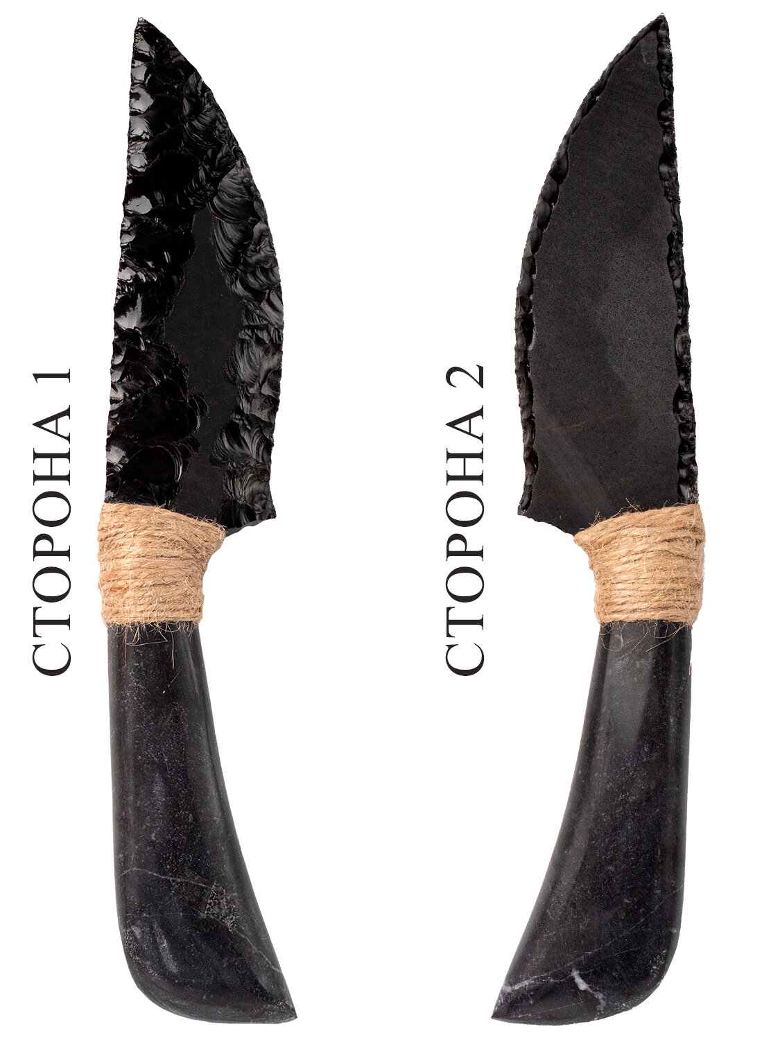 Рукоятка ножа изготовлена из черного мрамора. Лезвие ножа изготовлено из застывшей вулканической лавы – Обсидиана. В далекие времена Обсидиан использовали в изготовлении оружия, орудий труда и украшений. Его ценили за прочность и острые края, которые получались при его раскалывании. Нож из Обсидиана использовался в быту, на охоте, и был незаменимым спутником древнего человека.