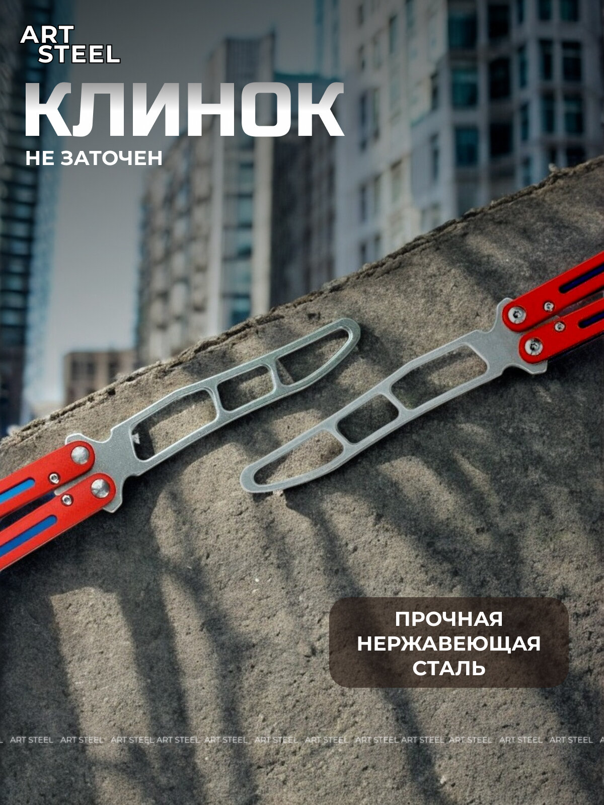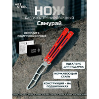 Тренировочный нож бабочка «Самурай» - это продуманная конструкция, прекрасная механика и выверенный баланс. Предназначены такие балисонги для изучения и оттачивания трюков флиппинга. Чтобы сделать тренировку максимально безопасной, на клинке нет никакой заточки и острых углов. Клинок изготовлен из стали марки 420, это относительно мягкая сталь, а значит при падениях ножа на клинке не будут появляться сколы. Ещё одним её достоинством можно назвать отличную коррозионную стойкость. Рукоять представляет собой пару стальных лайнеров из нержавеющей стали с накладками из G10. Накладки перфорированы, что дает безошибочное позиционирование и надёжное удержание в руке, а также улучшает баланс. Сами же половинки рукояти сцепляются специальным фиксатором, а вся конструкция осевых винтов для максимальной плавности хода оснащена стальными подшипниками. Комплектуется нож чехлом из кордуры и ключом torx. Данный ключ используется для самостоятельной регулировки плавности хода половинок рукояти и, в случае необходимости, разборки и чистки механизмов.