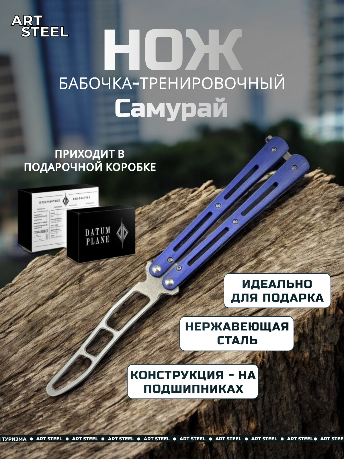 Тренировочный нож бабочка «Самурай» - это продуманная конструкция, прекрасная механика и выверенный баланс. Предназначены такие балисонги для изучения и оттачивания трюков флиппинга. Чтобы сделать тренировку максимально безопасной, на клинке нет никакой заточки и острых углов. Клинок изготовлен из стали марки 420, это относительно мягкая сталь, а значит при падениях ножа на клинке не будут появляться сколы. Ещё одним её достоинством можно назвать отличную коррозионную стойкость. Рукоять представляет собой пару стальных лайнеров из нержавеющей стали с накладками из G10. Накладки перфорированы, что дает безошибочное позиционирование и надёжное удержание в руке, а также улучшает баланс. Сами же половинки рукояти сцепляются специальным фиксатором, а вся конструкция осевых винтов для максимальной плавности хода оснащена стальными подшипниками. Комплектуется нож чехлом из кордуры и ключом torx. Данный ключ используется для самостоятельной регулировки плавности хода половинок рукояти и, в случае необходимости, разборки и чистки механизмов.