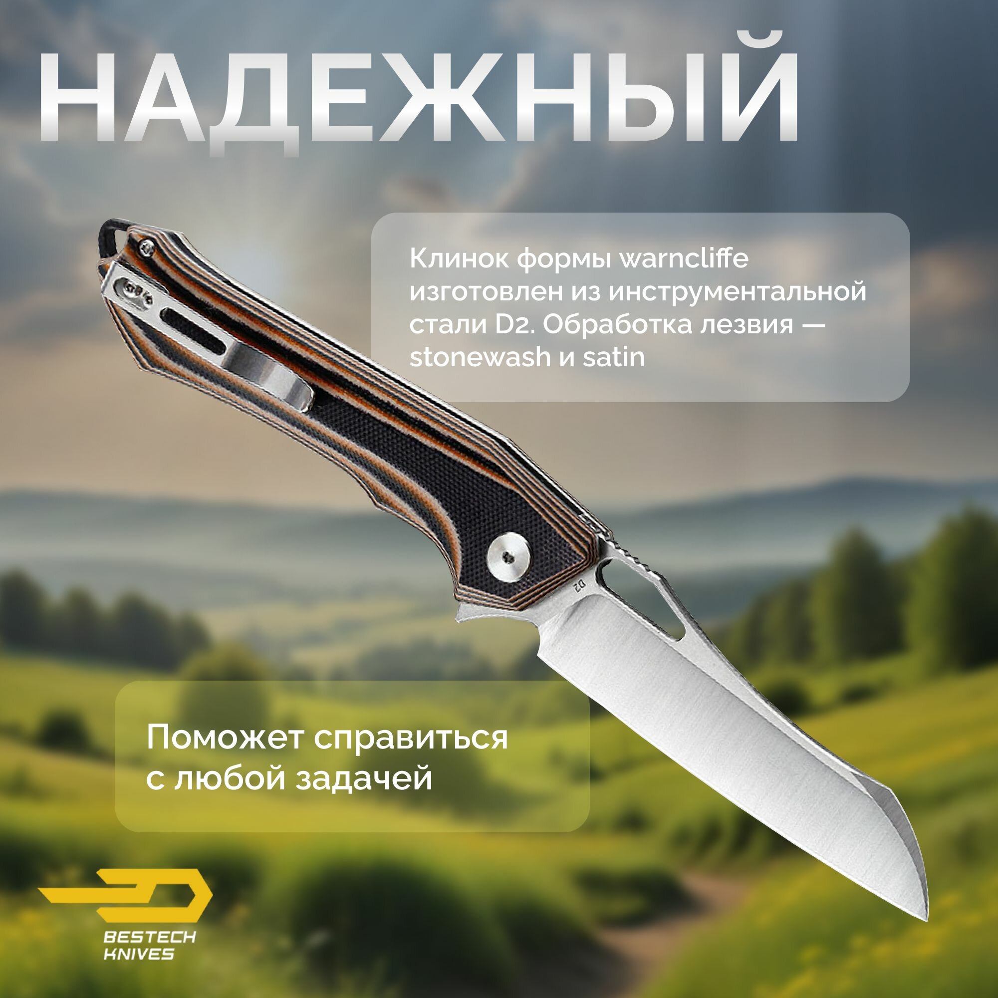 Описание ножа Bestech Platypus сталь D2, рукоять G10 черный-оранжевый-бежевый: