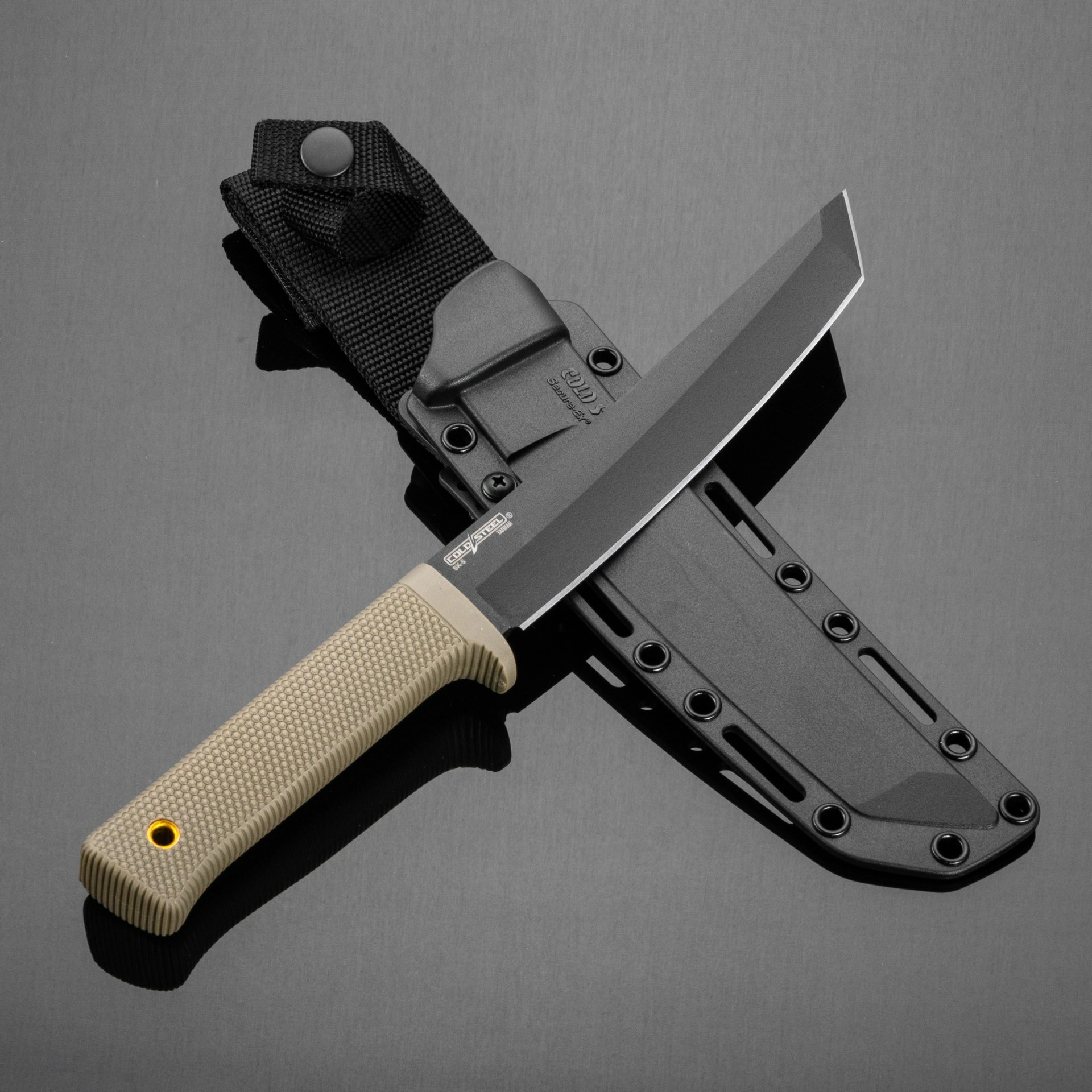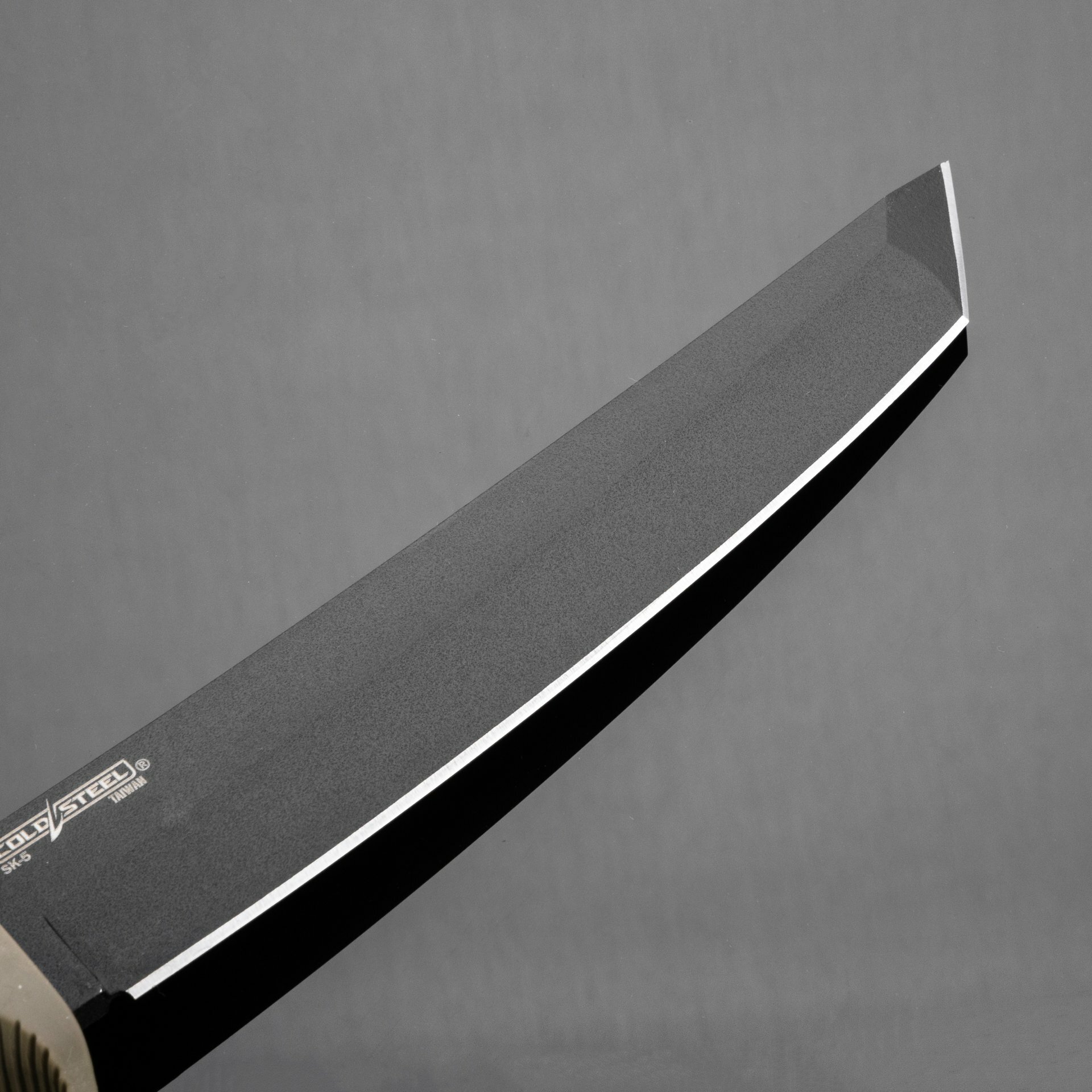 «Оптимизированную» версию из SK-5 делают на Тайване, куда пришлось перенести производство ради удешевления. Эта японская инструментальная сталь при хорошей термообработке показывает удивительное сочетание твёрдости и прочности, отлично выдерживая ударные нагрузки. Отличием Recon Tanto из стали SK-5 от прошлых версий стало сокращение рикассо (незаточенное пространство у основания клинка). Если раньше оно