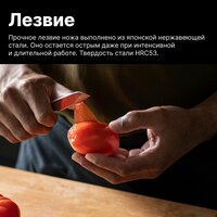 Нож для очистки овощей изготовлен из японской высокоуглеродистой стали, обеспечивающей отличные эксплуатационные характеристики и долговечность. HRC 58. Оптимальный баланс по центру между рукоятью и лезвием обеспечивает превосходное качество резки. Нож кухонный имеет бесшовную конструкцию из нержавеющей стали. Высококачественная высокоуглеродистая сталь обеспечивает долговечное использование при минимальной повторной заточке. При необходимости материал на 100% пригоден для вторичной переработки.
