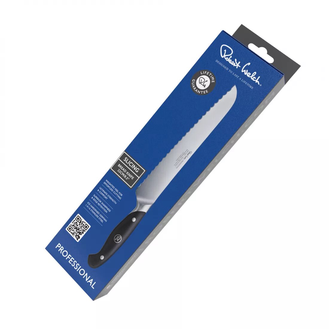 Нож для хлеба 22см Robert Welch Professional Силуэт каждого ножа был придуман в полном соответствии с его будущим предназначением, а режущие кромки ножниц по остроте ни в чем не уступают клинками профессиональных ножей. Залогом качественного использования рабочего инструмента повара, бесспорно, является материал, из которого он изготовлен. Для создания своих великолепных ножей дизайнеры Robert Welch использовали сырье премиум-класса. Клинки изделий этой группы изготавливаются из цельного куска немецкой стали DIN 1.4116. Этот высококачественный сплав обеспечивает лезвию прочность, твердость до 56 единиц по шкале Роквелла, а также бритвенную остроту режущей кромки.