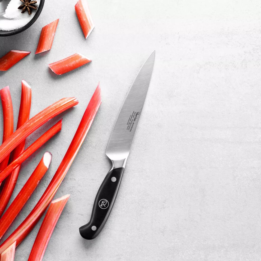Нож универсальный 14см Robert Welch Professional Силуэт каждого ножа был придуман в полном соответствии с его будущим предназначением, а режущие кромки ножниц по остроте ни в чем не уступают клинками профессиональных ножей. Залогом качественного использования рабочего инструмента повара, бесспорно, является материал, из которого он изготовлен. Для создания своих великолепных ножей дизайнеры Robert Welch использовали сырье премиум-класса. Клинки изделий этой группы изготавливаются из цельного куска немецкой стали DIN 1.4116. Этот высококачественный сплав обеспечивает лезвию прочность, твердость до 56 единиц по шкале Роквелла, а также бритвенную остроту режущей кромки.