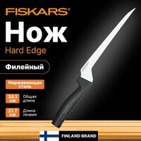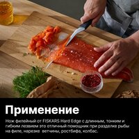 Филейный нож Fiskars Hard Edge 22 cm (1054946) с длинным, тонким и гибким лезвием – отличный помощник при разделке рыбы на филе, нарезке крупных кусков ветчины, ростбифа, колбас и других продуктов, требующих деликатной и точной нарезки.