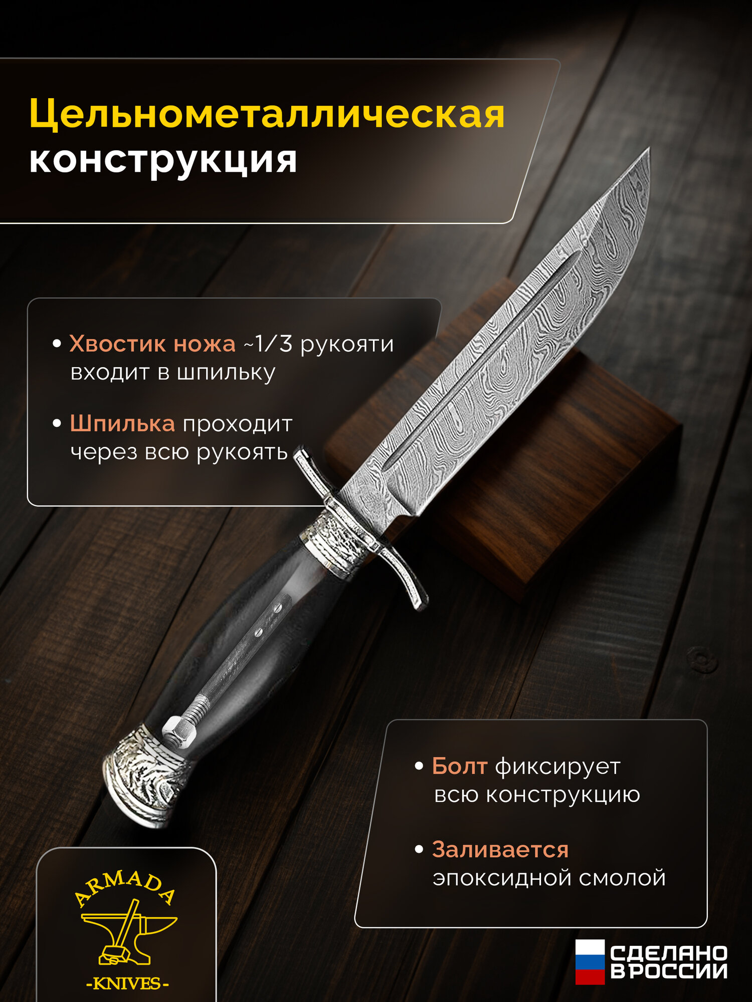 Представляем вашему вниманию нож Финка НКВД от известного бренда ARMADA KNIVES - настоящий шедевр мастерства и качества! Этот нож изготовлен из дамасской стали, которая славится своей прочностью, долговечностью и уникальной эстетикой.